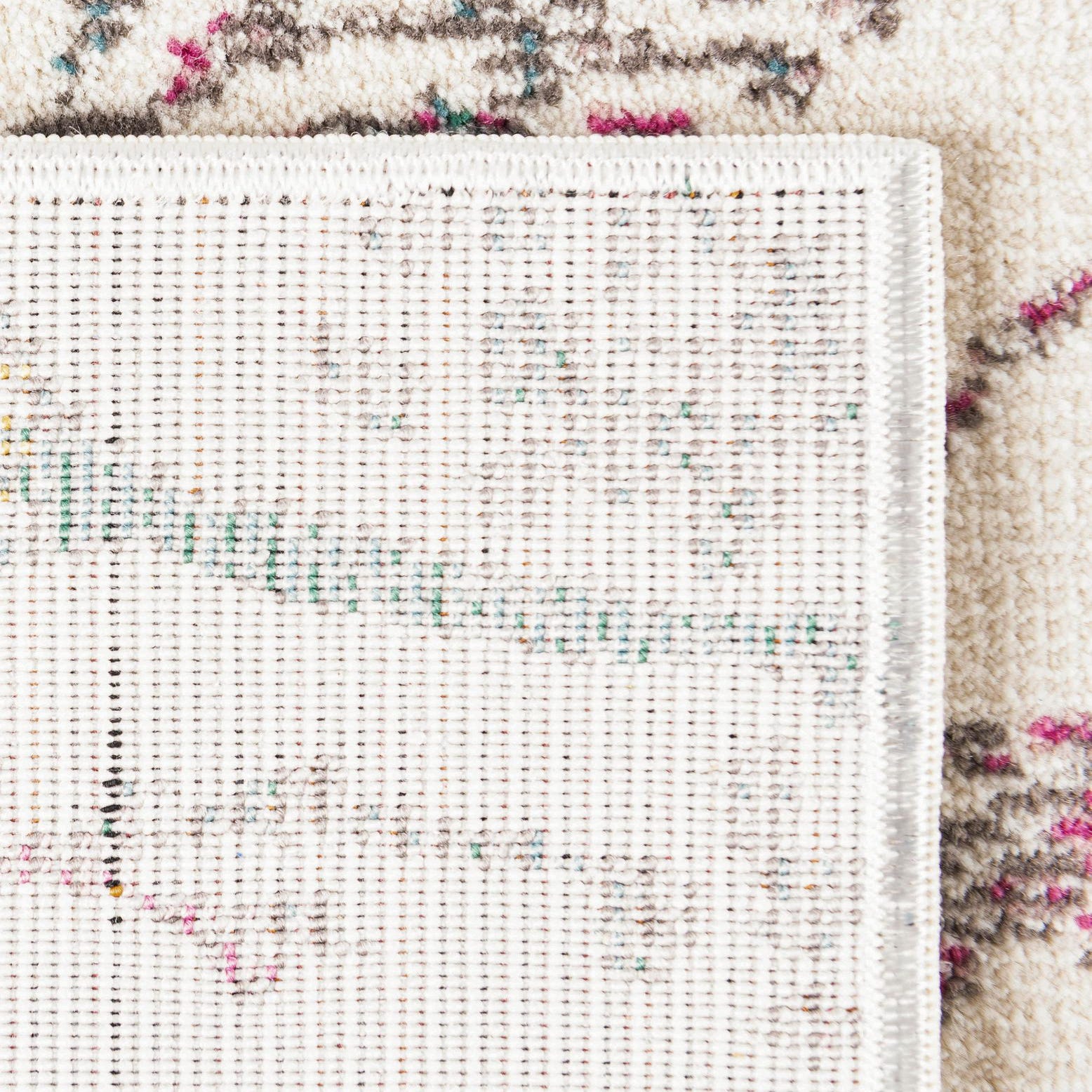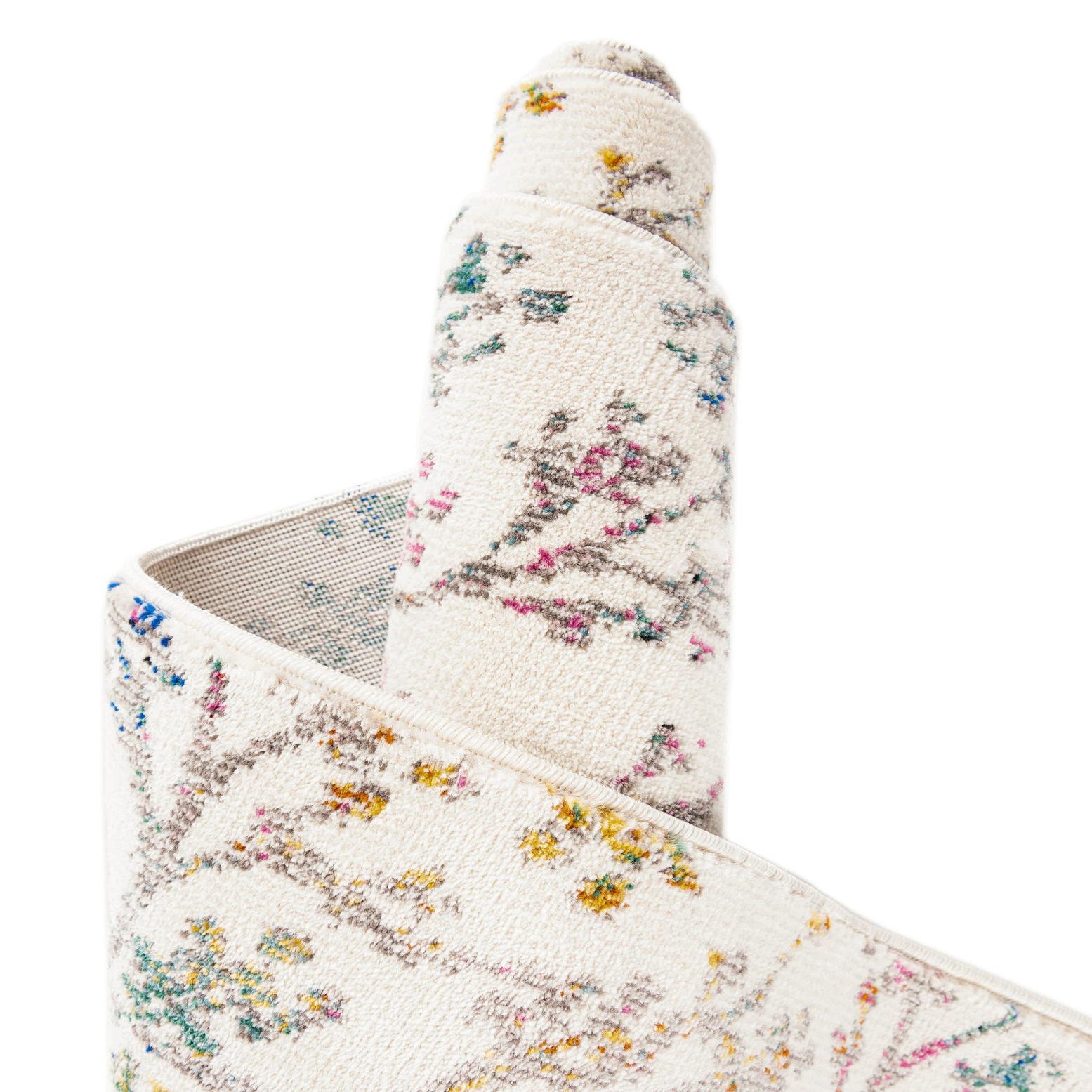 Ivory provides a clean, airy field for a delicate botanical pattern of branching sprigs and tiny buds. The branches are rendered in a soft palette of gray, navy blue, red, yellow and pink, creating a layered, watercolor-like effect against the ivory background. Machine-made construction and a 100% polypropylene pile give the surface a low-profile, tightly woven texture that feels smooth underhand and underfoot, with consistent loop and cut details that define each leafy silhouette.