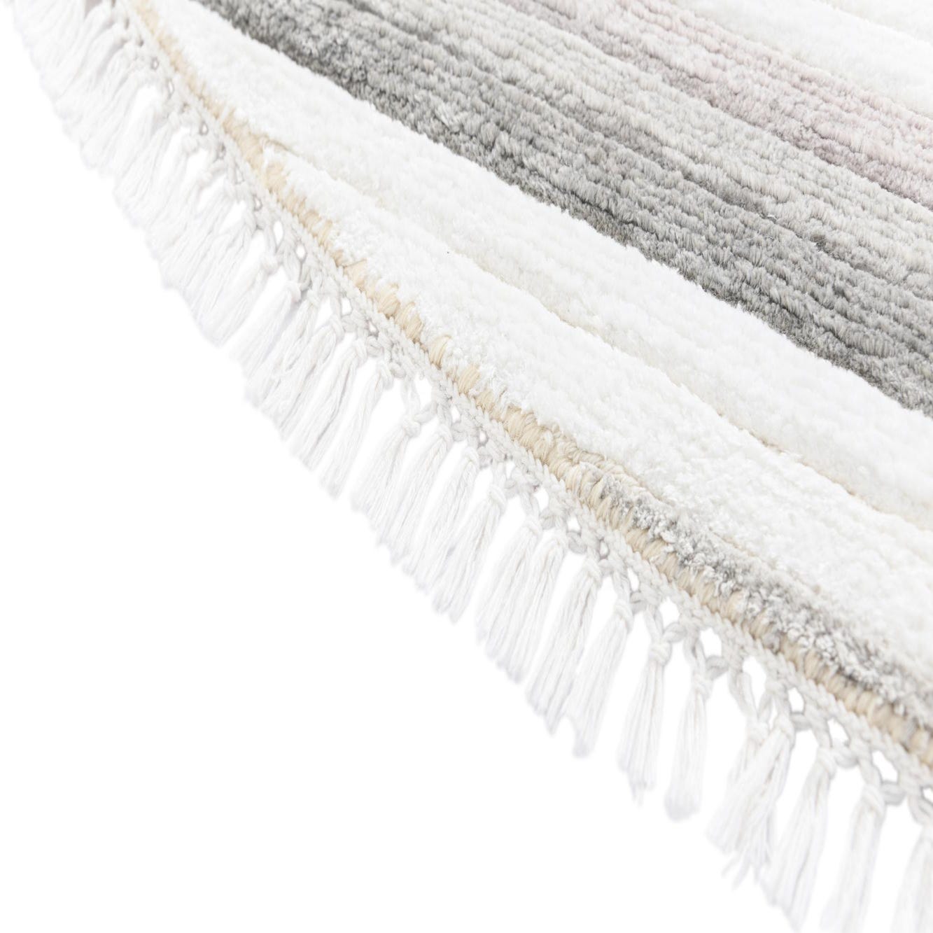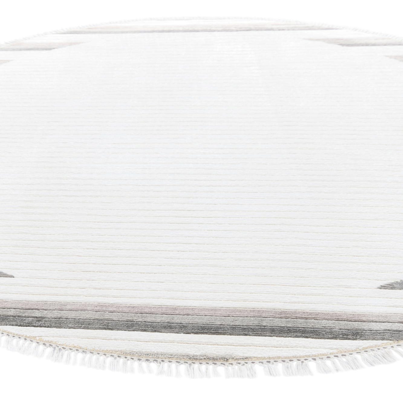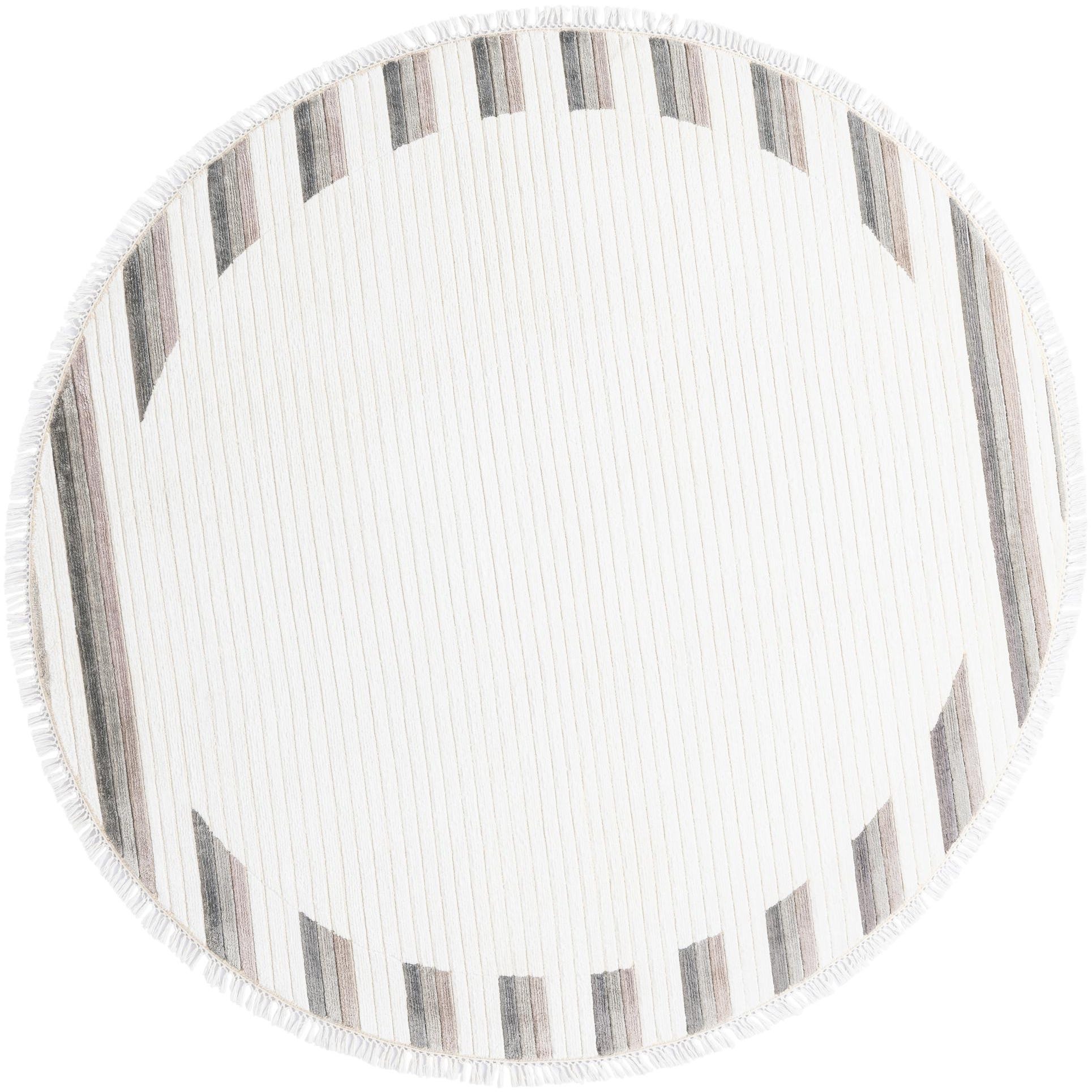 A round ivory and cream wool rug with a modern oriental pattern of gray and brown stripes around the border, featuring a high pile and fringe.