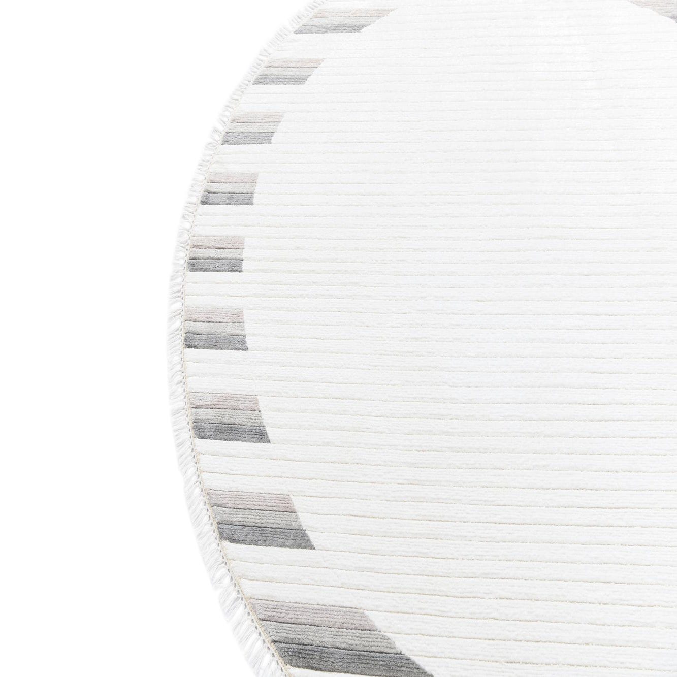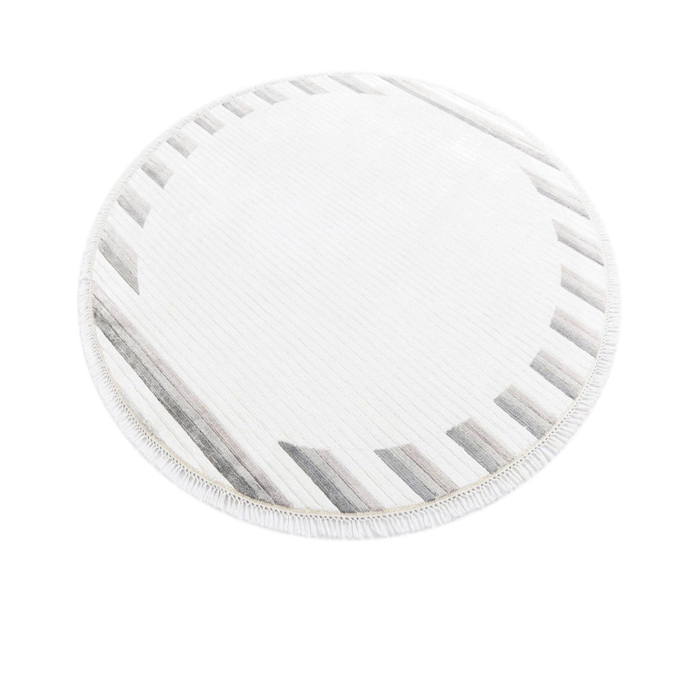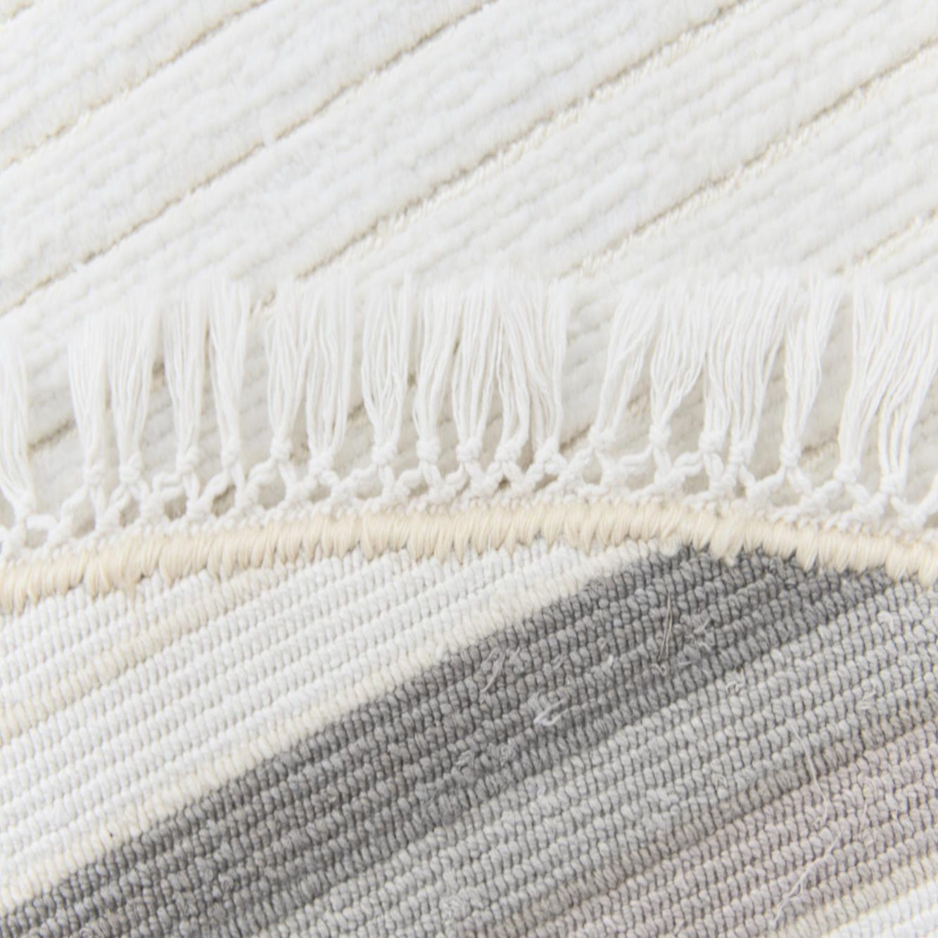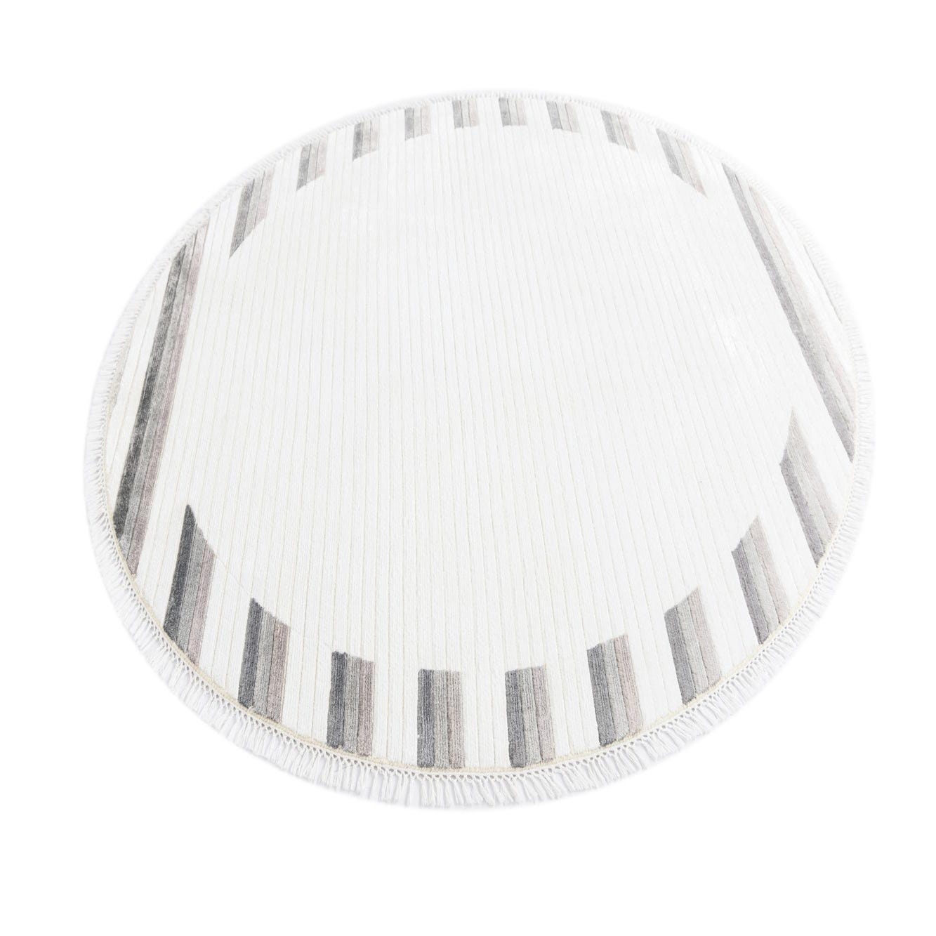 A round ivory and cream wool rug with a modern oriental pattern of gray and brown stripes around the border, featuring a high pile and fringe.