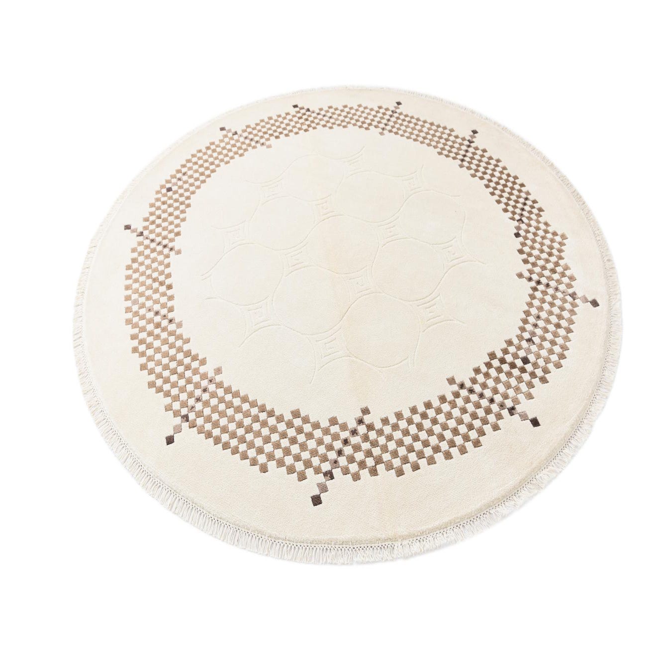 A round ivory wool rug with a modern oriental pattern of brown geometric squares forming a border, perfect for a living room.