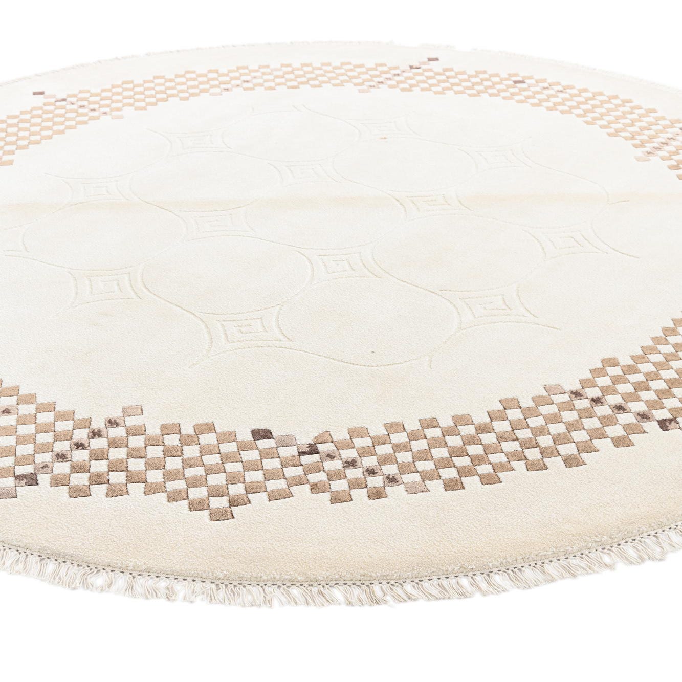 The Darya Collection presents a 6-foot round hand-knotted rug crafted from 100% wool, showcasing a harmonious blend of practicality and aesthetic appeal. The rug features a serene ivory backdrop, complemented by a pattern of brown and light brown tones. Geometric accents and a subtle, muted checkerboard pattern along the border add depth to the design, while the ivory central field is adorned with an understated geometric medallion for a poised look.