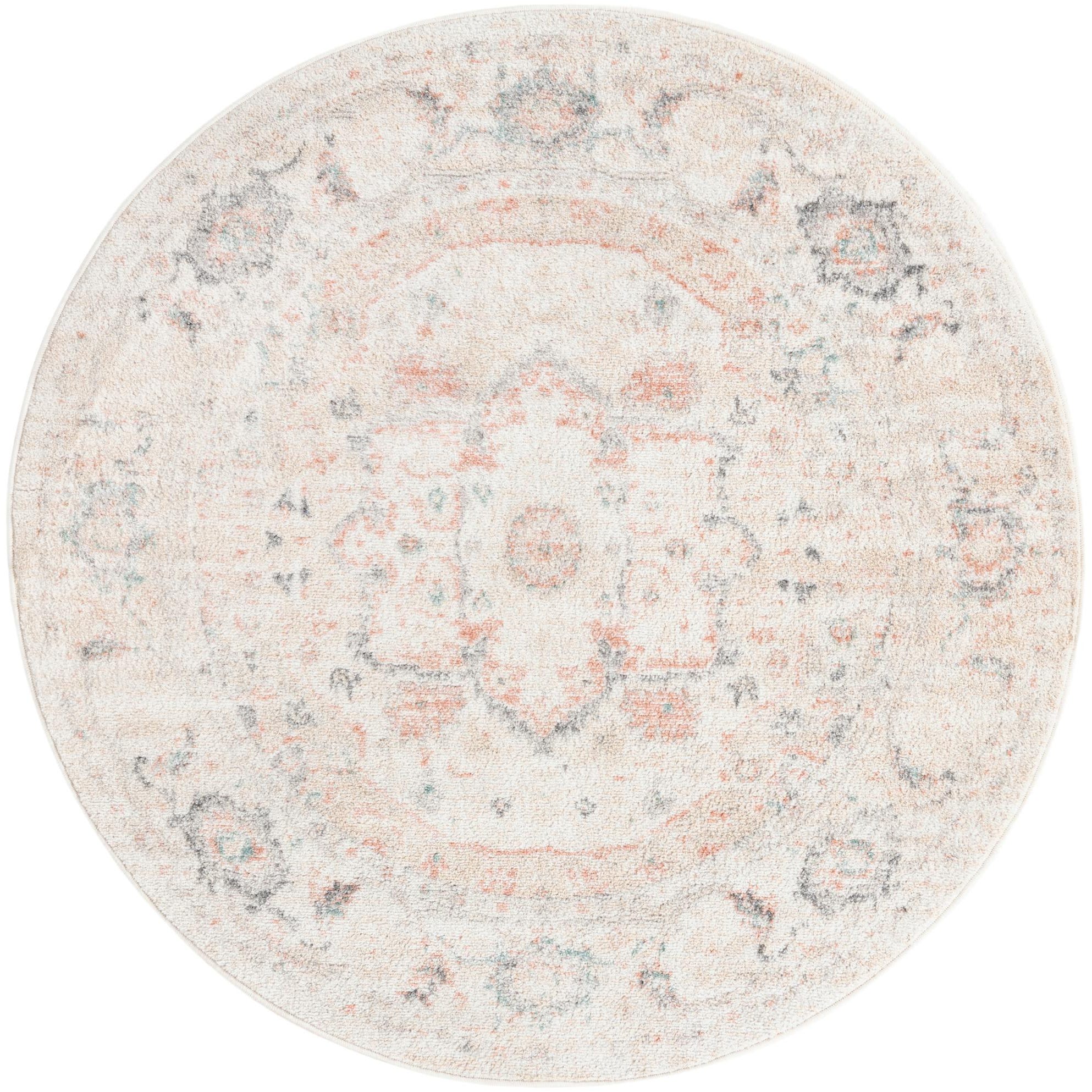 A softly distressed medallion anchors this round rug, its ivory background providing a light, airy base for faded floral and scroll motifs. Gray outlines define the pattern while soft pink highlights add warmth and a gently aged character. Machine-made from 100% polypropylene, the surface has a low, even pile that feels smooth underfoot with a slight plushness—substantial enough to sit comfortably beneath bare feet but low-profile for layered looks.