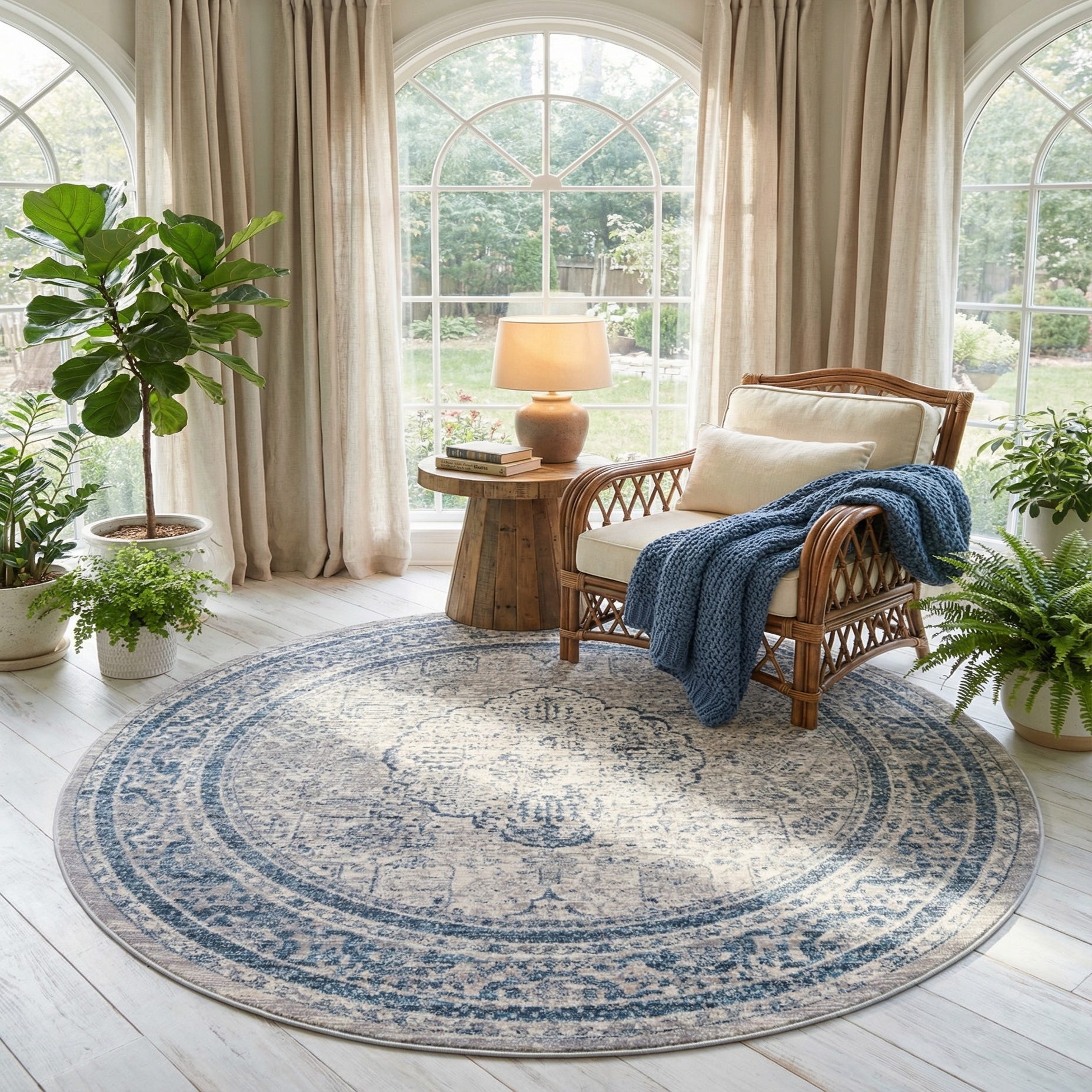 A round medallion rug with a softly distressed, vintage-inspired pattern that balances classic detail with a relaxed, worn look. The ivory field provides a light, neutral backdrop while layers of beige and gray give the surface a lived-in patina. Navy blue and light blue accents define the central medallion and surrounding border, creating subtle contrast without overpowering the palette. Machine made from 100% polyester, the rug has a low-pile, tightly woven face that feels smooth and slightly cushioned underfoot while showcasing the faded motif.
