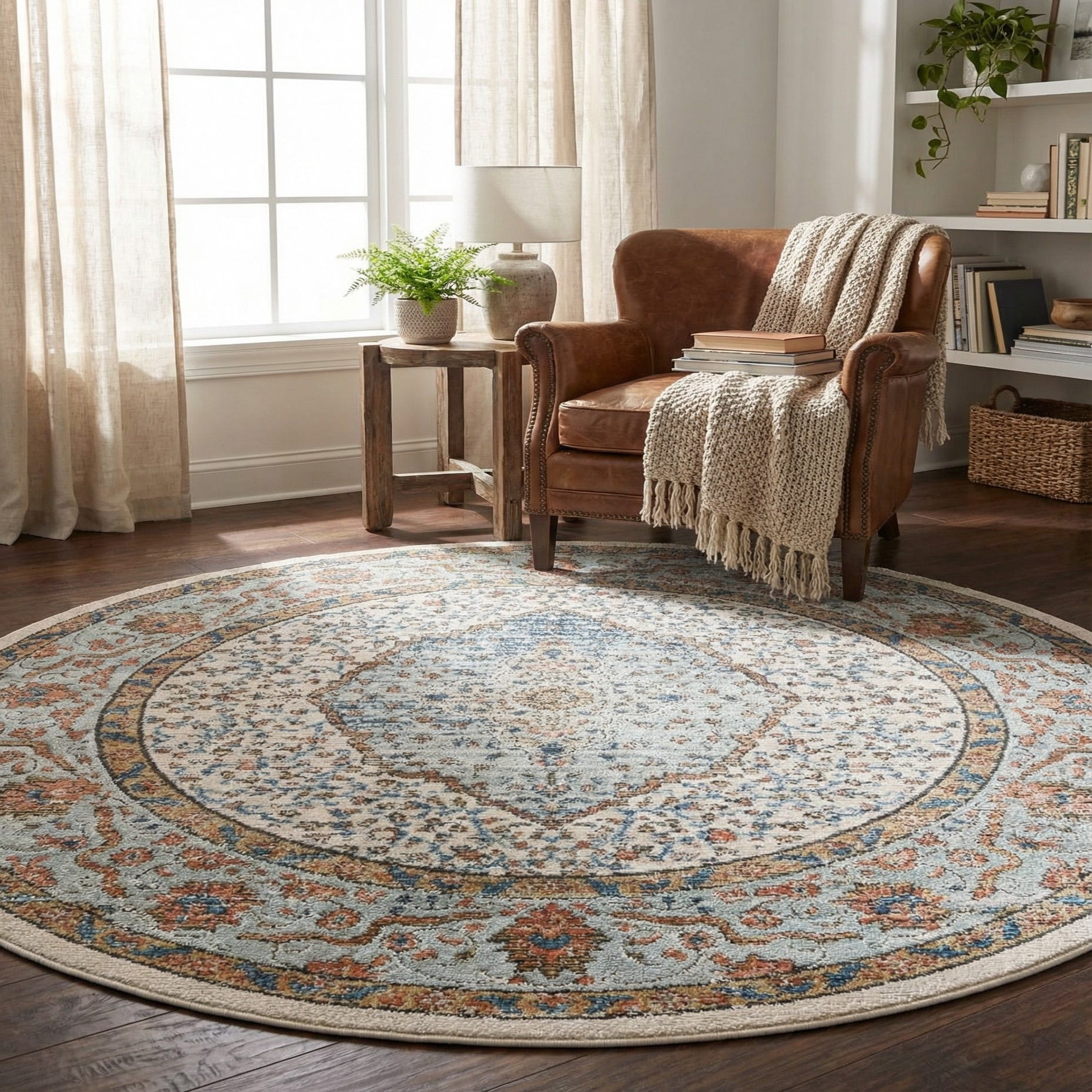 A traditional medallion takes center stage on this round rug, set against an ivory field that brightens the overall design. Intricate floral motifs and a scrolling border in shades of blue, light blue, brown and rust red surround the medallion, creating a softly aged, vintage-inspired look. Machine-made from 100% polypropylene, the rug has a low-profile pile with a smooth, slightly dense texture that feels comfortable underfoot while keeping the pattern crisp.