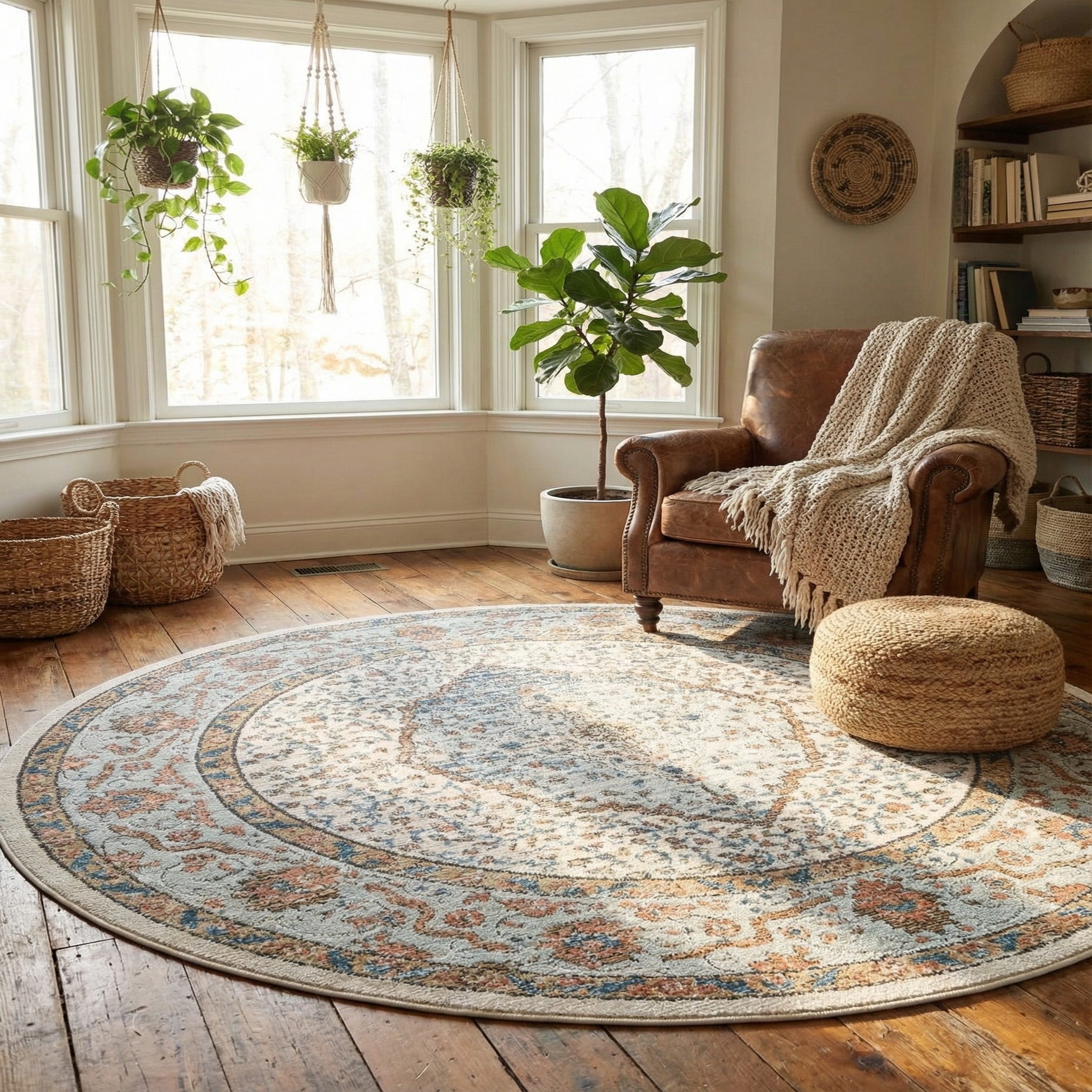 This rug works well beneath a round coffee table or as an anchor for a breakfast nook or conversation corner, and it pairs easily with warm wood tones, painted furniture, or leather seating. The blue and light-blue tones bring a cool, calming presence that complements coastal, cottage, and transitional interiors, while the rust red and brown accents add warmth for more traditional or farmhouse settings.