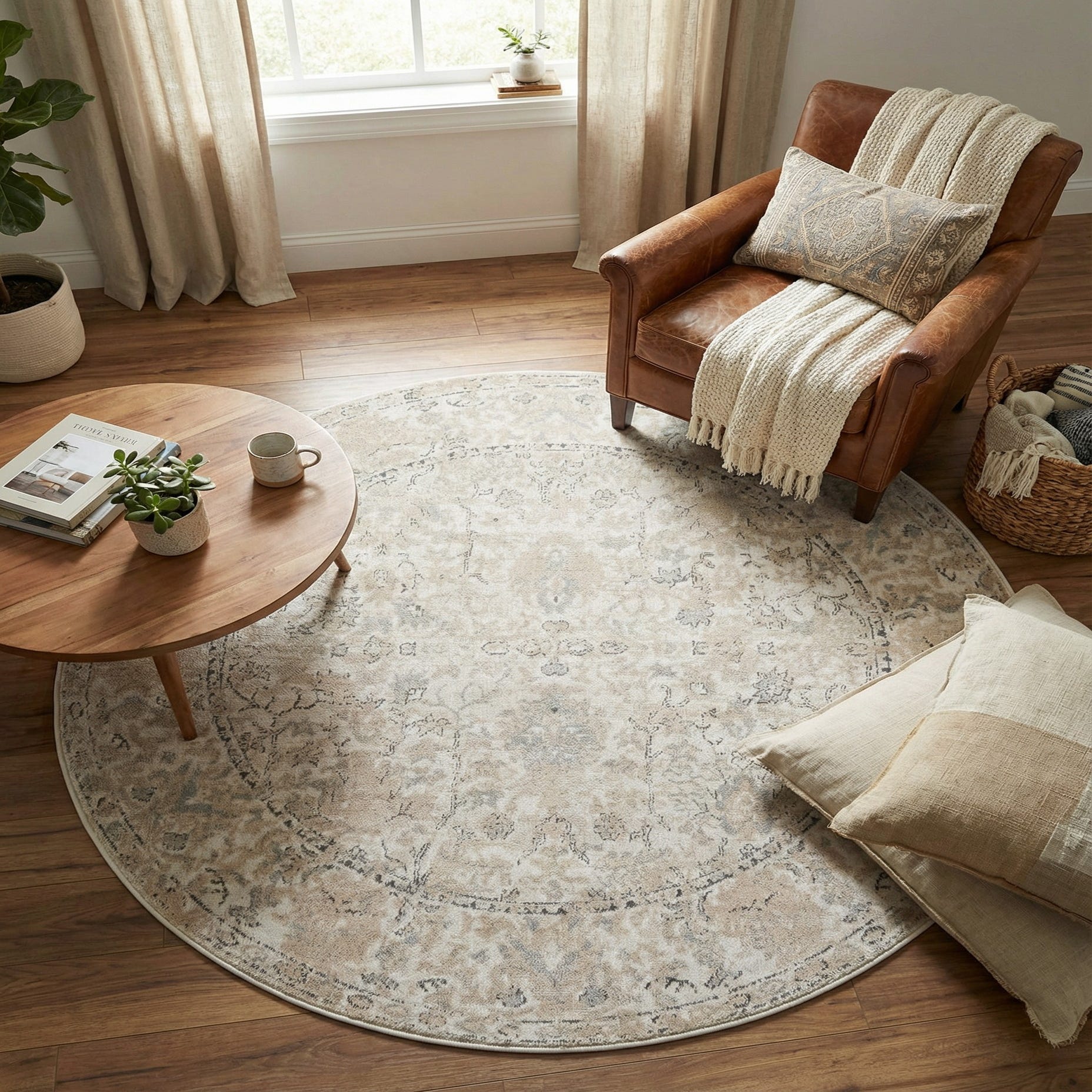 A softly distressed, traditional medallion pattern rests on an ivory background, where layered beige and tan fields are punctuated by subtle gray accents that trace floral and scroll motifs. The design reads as a relaxed, vintage-inspired antique with a faint central medallion and a narrow circular border that gives the piece a timeless, lived-in look. The neutral palette keeps the pattern gentle and understated, letting texture and tonal variation take the visual lead.