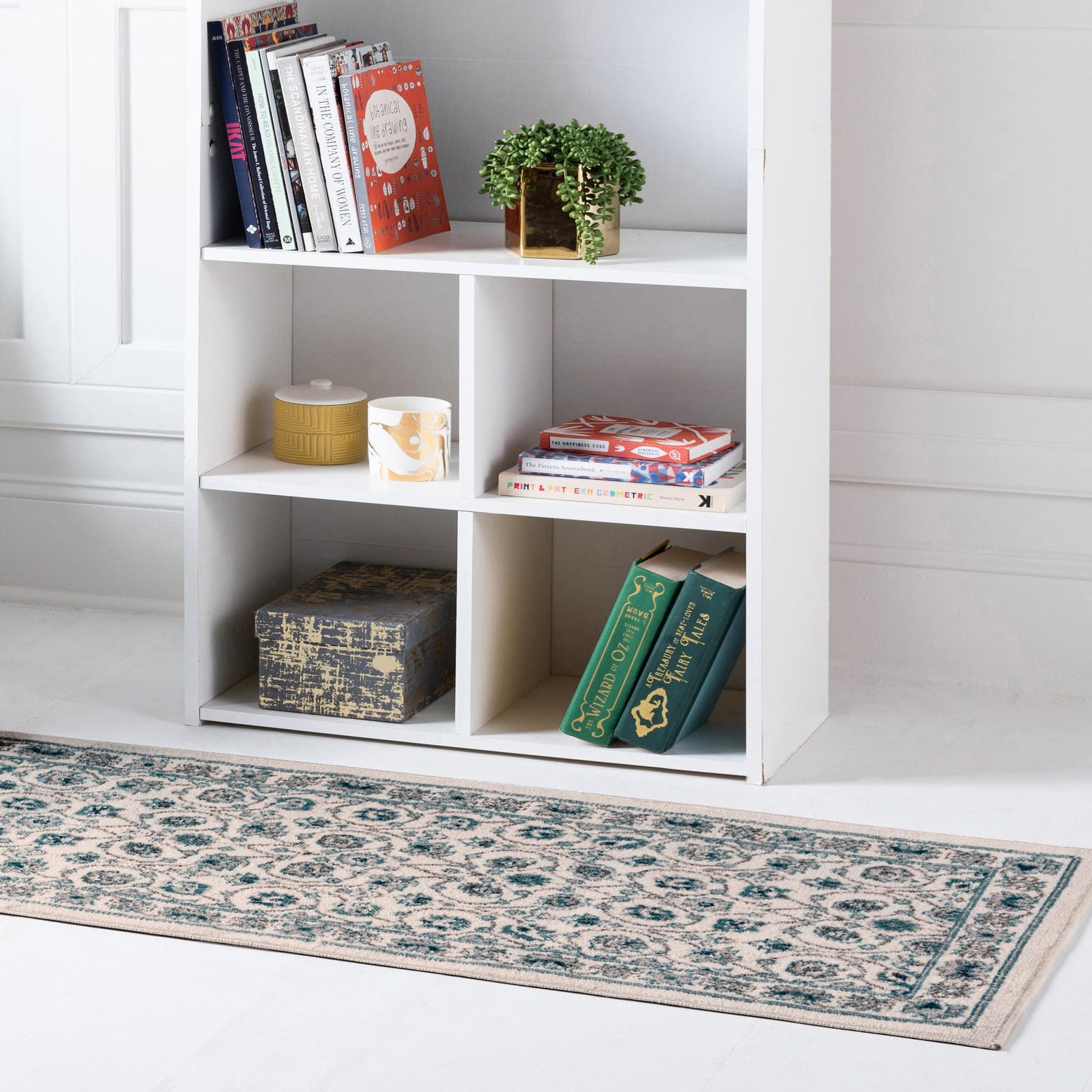 A 6 ft runner rug with a traditional botanical pattern in ivory, cream, white, and teal, perfect for a hallway.
