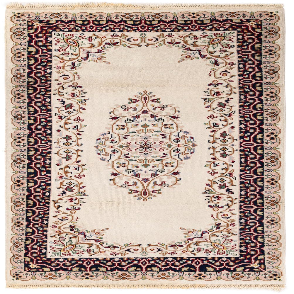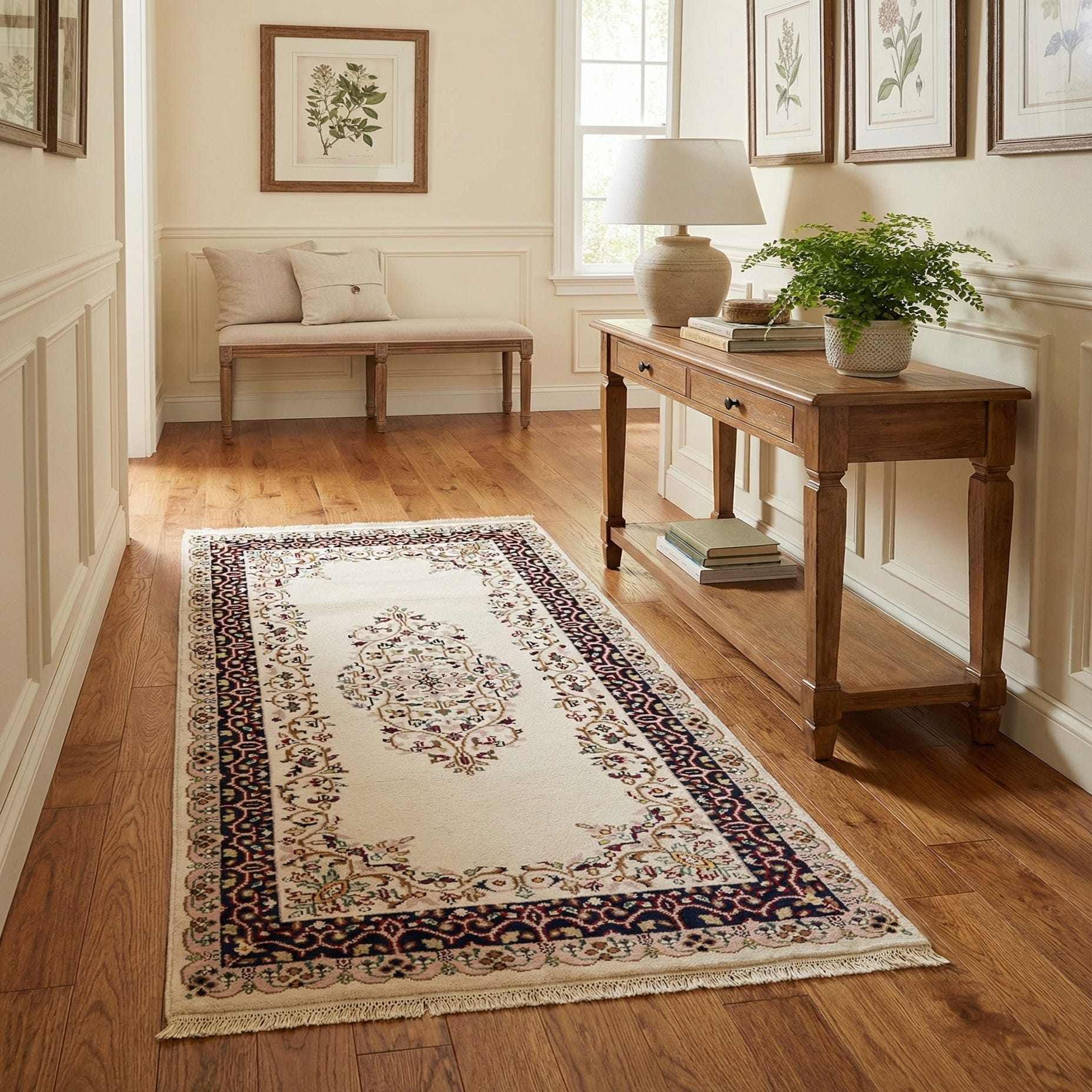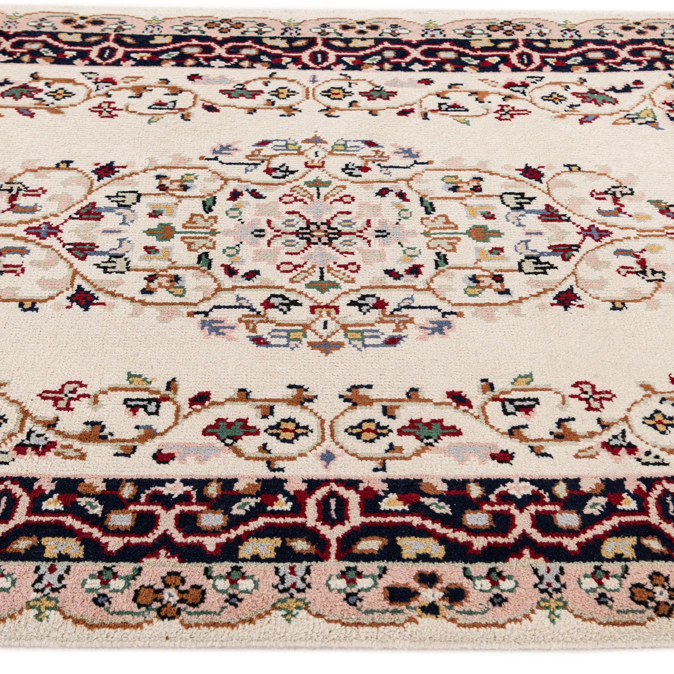 A 6 ft runner rug with an ivory field and a traditional medallion design, featuring intricate floral patterns in red, blue, and pink.
