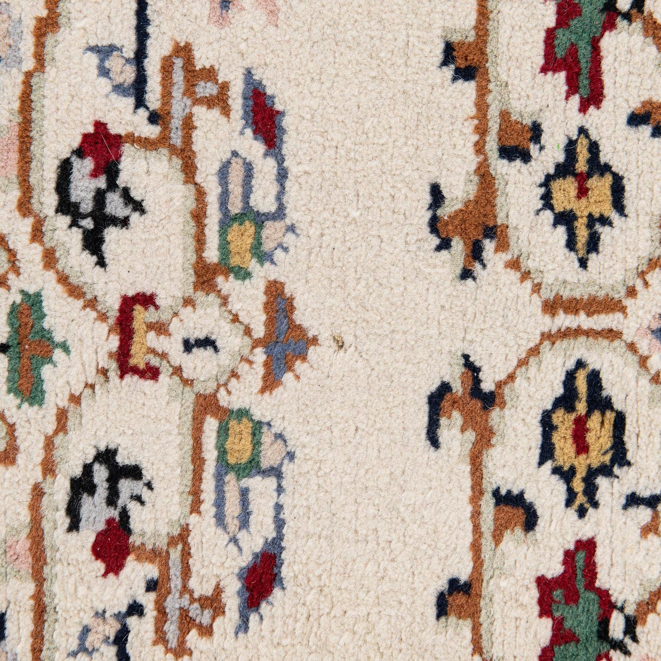 Primary color is Ivory. Colors in this rug include: Ivory, Beige, Black, Blue, Brown, Red, Yellow.