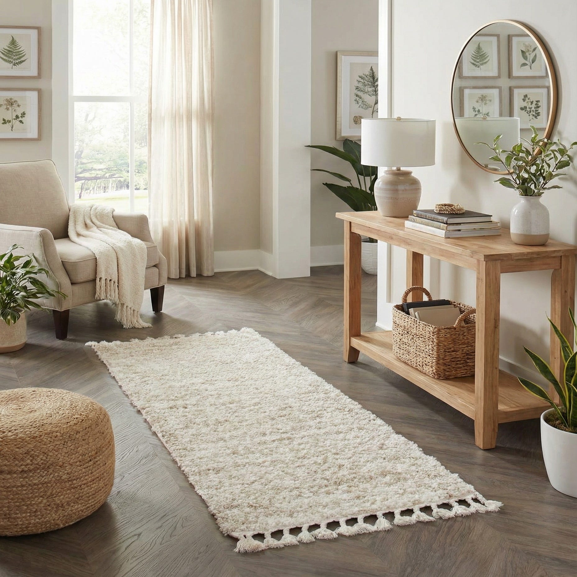 Machine-made from 100% polypropylene, this runner blends a relaxed, contemporary aesthetic with practical durability. Place it along a hallway to soften a traffic path, alongside a bed for a cozy bedside landing, or layered in a living area over wood flooring for added warmth. It works well with Scandinavian, modern farmhouse, coastal, and minimalist interiors, pairing especially nicely with light woods, muted linens, and soft metallic accents.