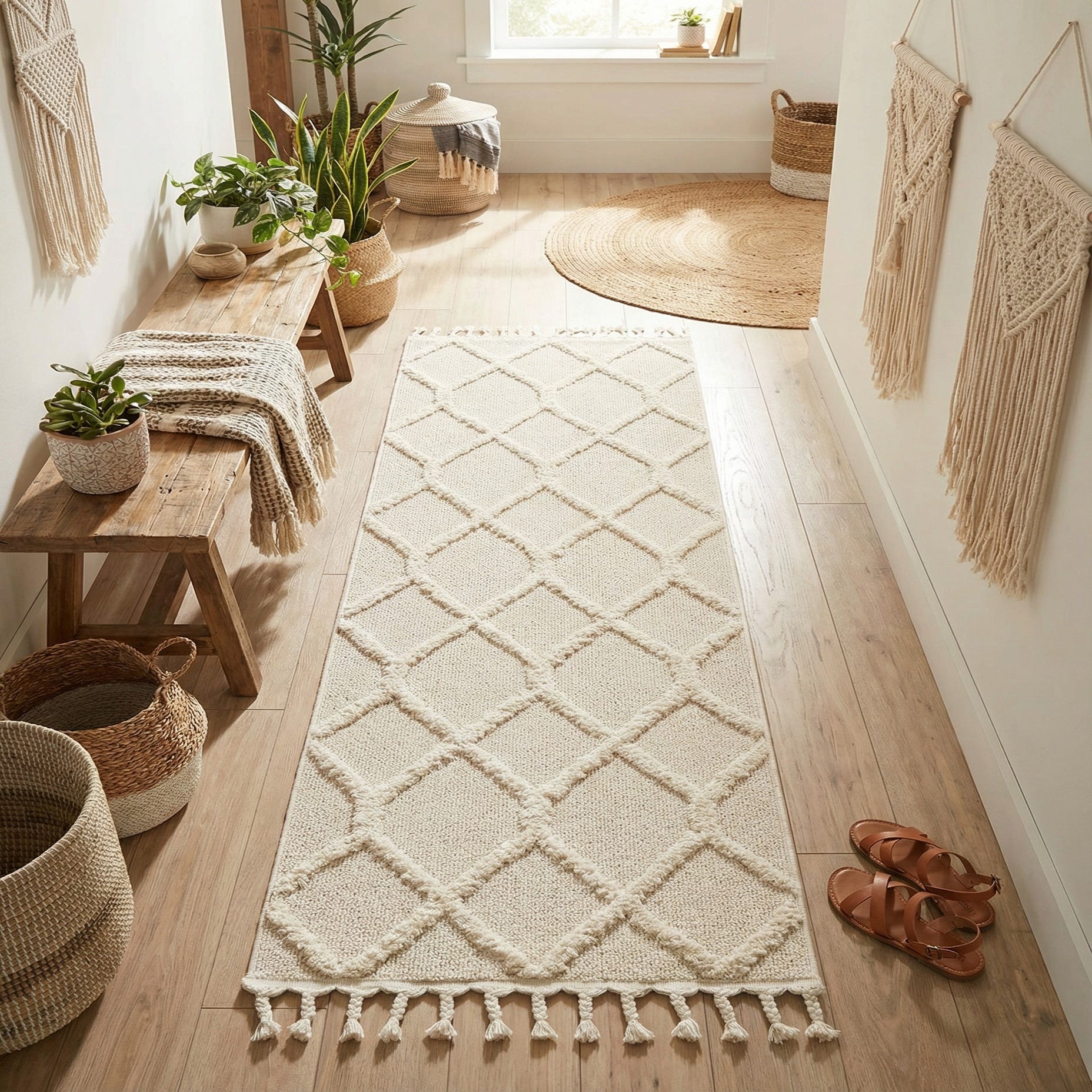 This runner works well in narrow spaces where you want a touch of texture and warmth: a long entry hall, a kitchen galley, or layered at the side of a bed. Its neutral ivory palette and subtle geometric motif fit clean, modern interiors as easily as relaxed, bohemian or coastal schemes—pair it with light woods, woven baskets, and linen textiles for a calm, collected feel.