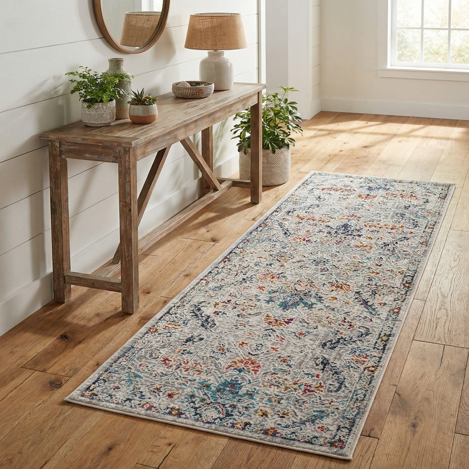 This long, narrow design works especially well in hallways, entryways, beside beds or along kitchen aisles where you want pattern and color without overwhelming the space. Pair it with light wood floors and white or warm gray walls for a fresh, transitional look, or layer it into an eclectic or bohemian scheme with brass accents and jewel-toned pillows to echo the navy and violet highlights. The gold and pink accents also make it a good match for warm metal finishes and mixed-textile seating areas where a touch of vintage character is desired.