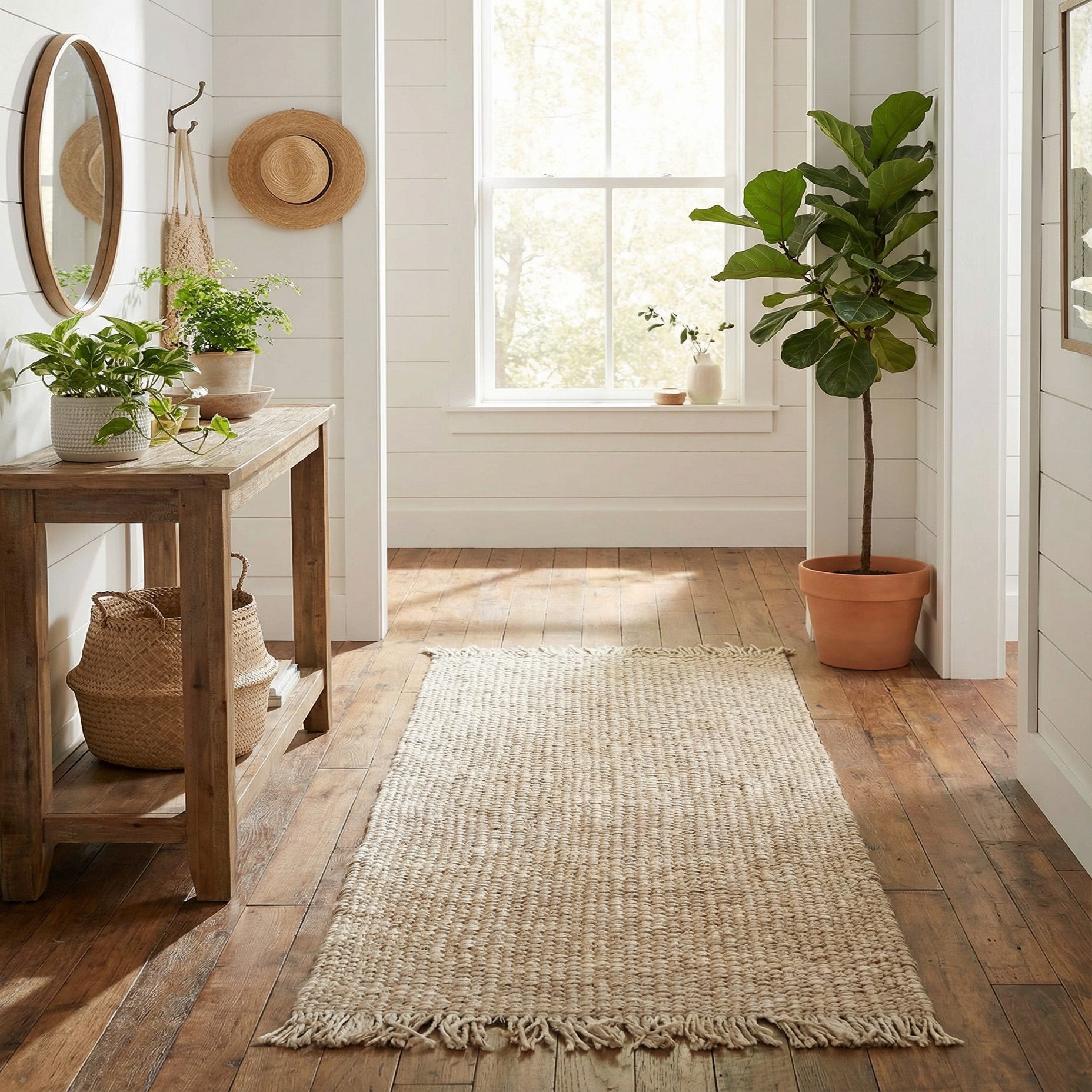 Hand-woven from 100% jute, this runner has an open, chunky weave in an ivory ground with subtle natural jute highlights. The texture is nubby and tactile—firm underfoot but with a soft, organic hand—and the simple, tight weave creates a quietly patterned surface rather than a printed motif. Short fringed ends add a casual, finished edge that enhances the rug’s handcrafted feel.