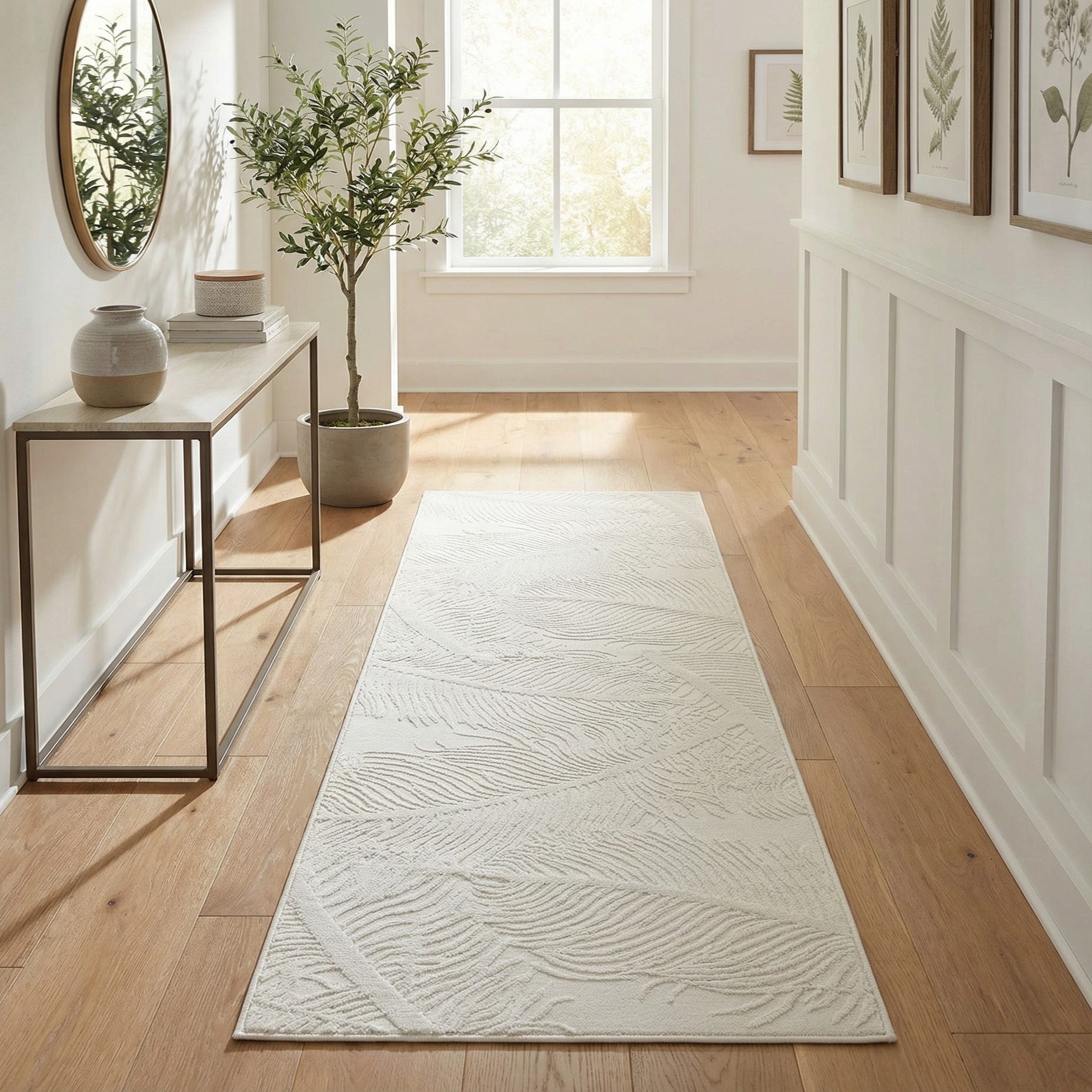 A 6 ft runner rug in shades of ivory and cream with a subtle textured tropical leaf pattern, ideal for a hallway.