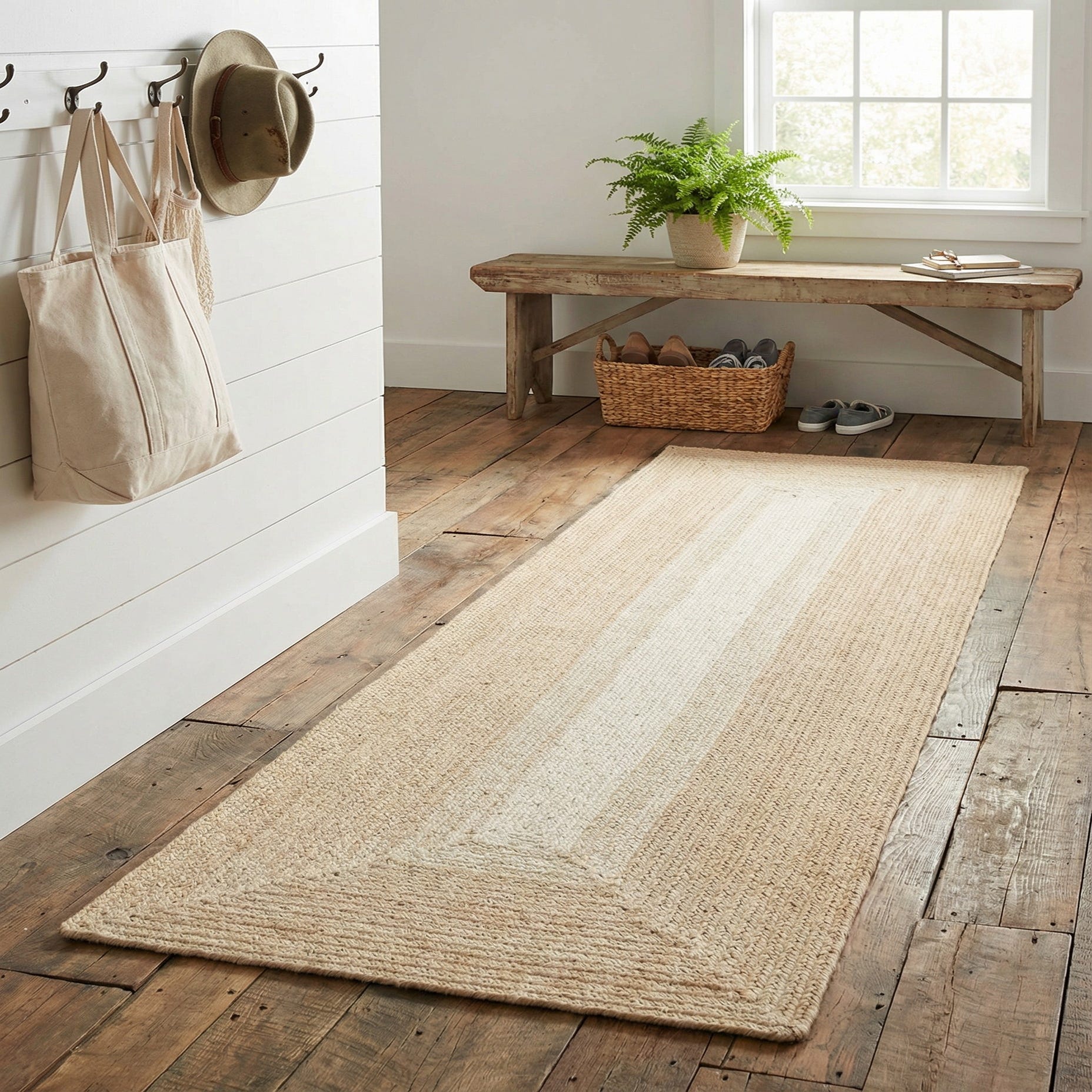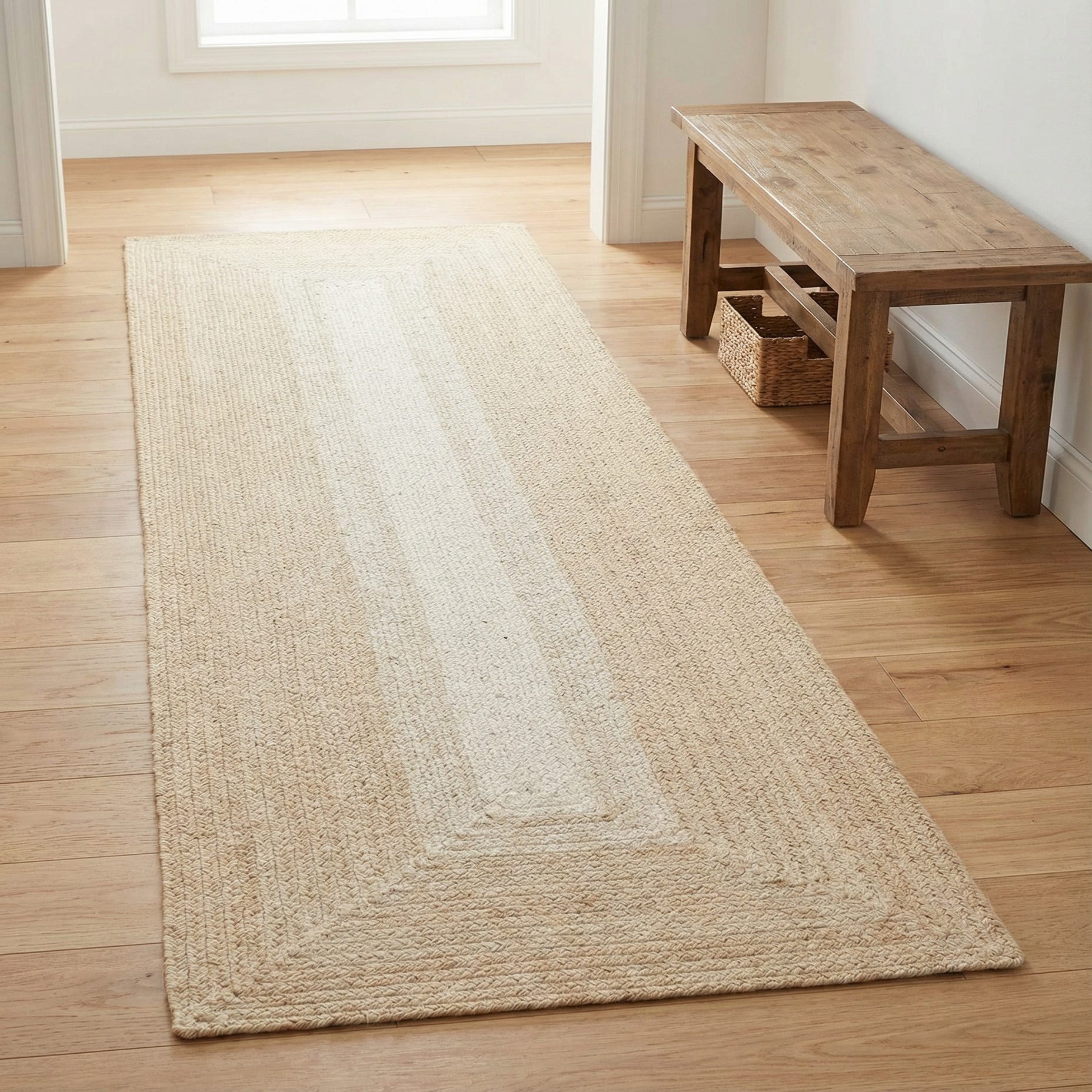 A 6 ft runner rug with a braided texture in varying shades of ivory and cream, ideal for a hallway.