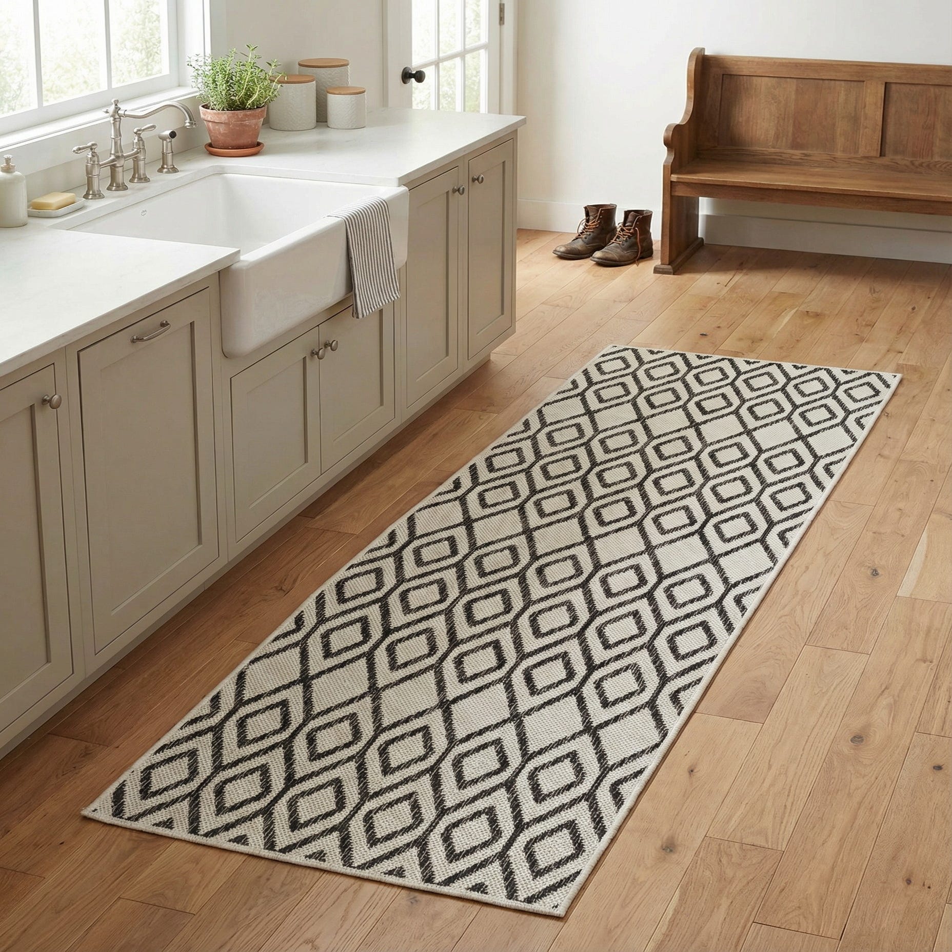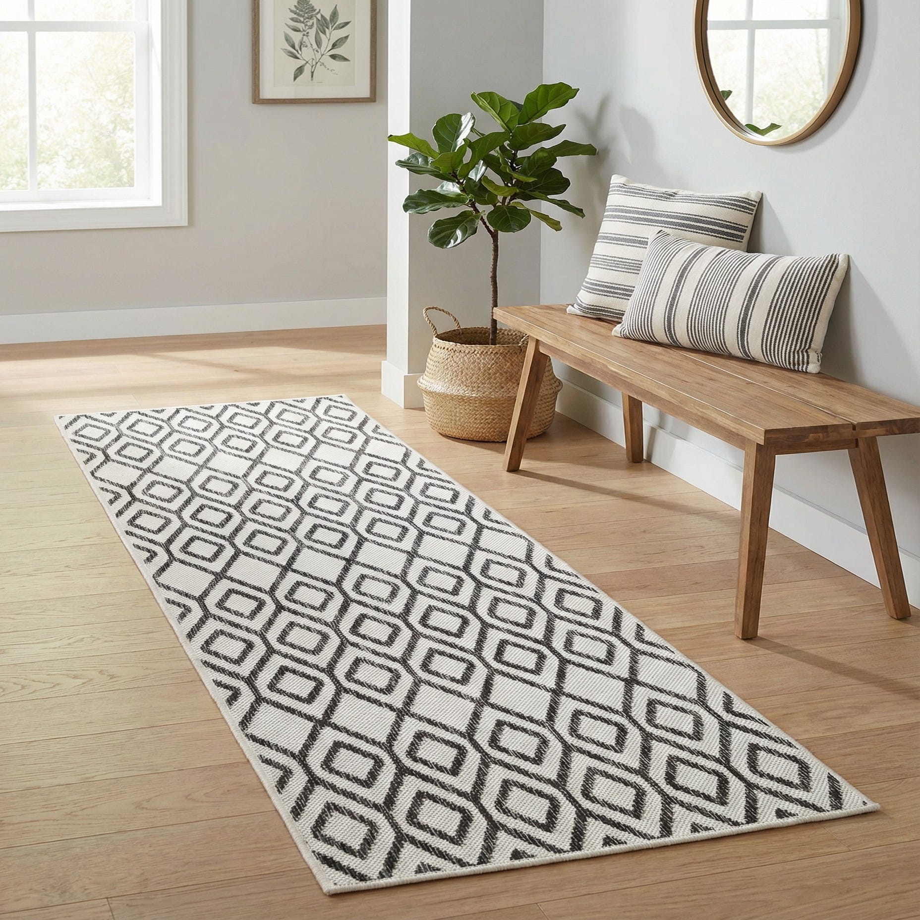 Machine-made from 100% polypropylene, the rug has a low-profile, flatwoven texture that feels firm yet slightly textured underfoot. Its construction makes it well suited for a covered patio, a busy entryway, or a narrow kitchen corridor. Pair it with light wood floors and matte black accents for a modern minimal look, layer it in a coastal or Scandinavian scheme with natural fibers and neutral upholstery, or use it to add pattern to a transitional room with mixed metals and warm woods.