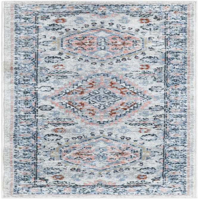 An antique-inspired medallion runner with a faded, distressed finish, this piece rests on an ivory ground that brightens a space while letting the pattern hold center stage. Soft, low-profile polyester pile delivers a smooth, slightly plush hand underfoot with a gentle sheen. The design layers concentric medallions and floral motifs in a muted palette — light blue and navy forms the cooler anchor tones while rust red and soft pink add warm, unexpected pops, all tied together with touches of gray for depth.