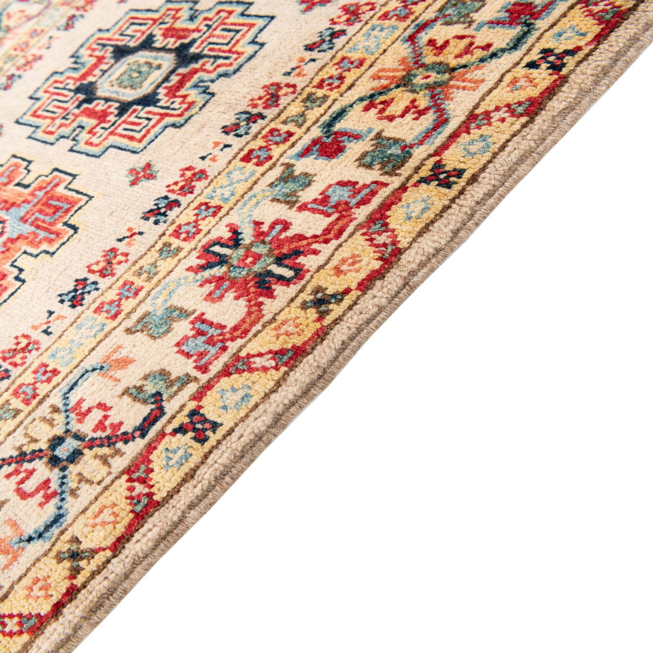 Primary color is Ivory. Colors in this rug include: Ivory, Green, Navy Blue, Red, Yellow, Light Blue.