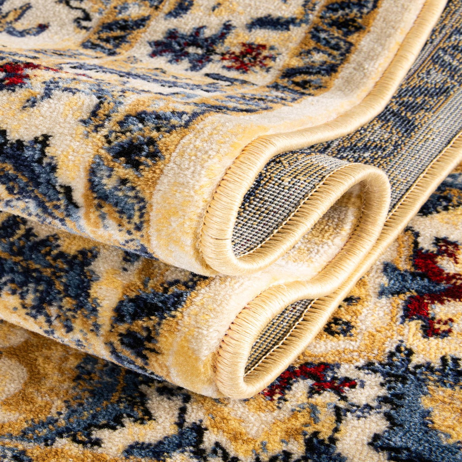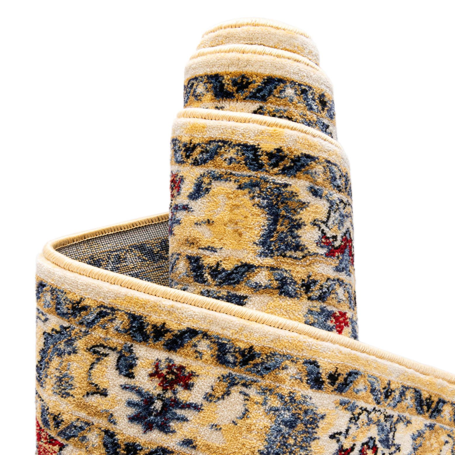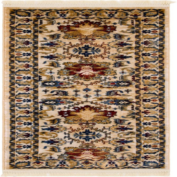 Primary color is Ivory. Colors in this rug include: Ivory, Beige, Black, Blue, Red.