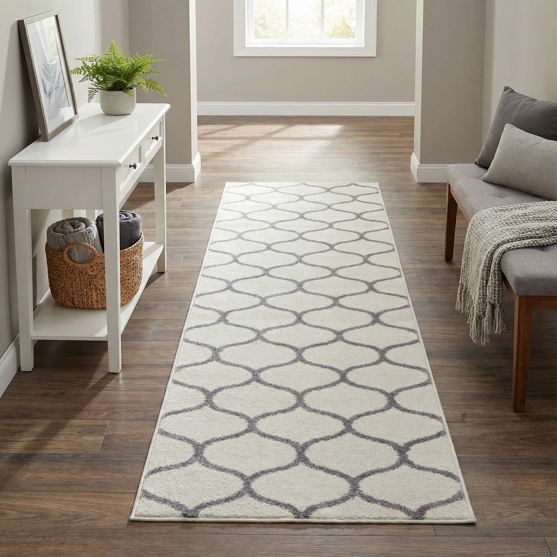 This narrow runner fits hallways, entryways, and kitchen aisles, or layered in front of a sofa or console to add linear interest. It complements contemporary and transitional schemes as well as Scandinavian or modern farmhouse decor, pairing nicely with light wood floors, cool grays, and linen or cotton textiles. The neutral ivory-and-gray palette provides a versatile anchor that brings pattern and warmth without overpowering the room.