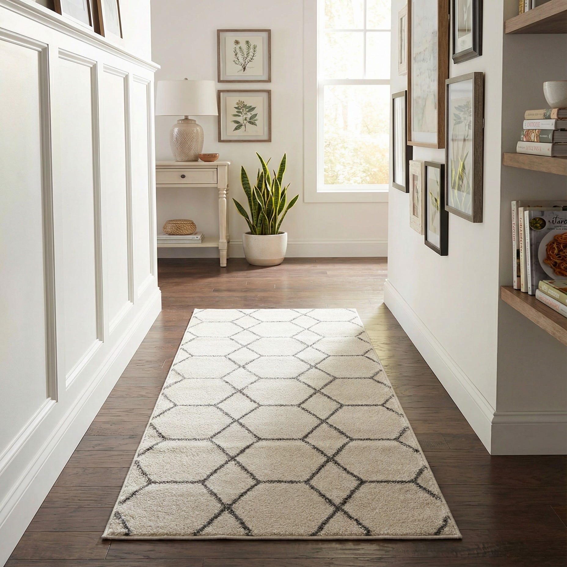Designed as a runner for narrow spaces, this piece works well in hallways, entryways, kitchens, or alongside a bed. Pair it with light wood floors and neutral upholstery for a Scandinavian or modern look, add matte black metal accents for an industrial touch, or layer with woven textures and warm woods for a relaxed, transitional feel. The neutral palette and geometric motif make it easy to coordinate with a range of decor styles.