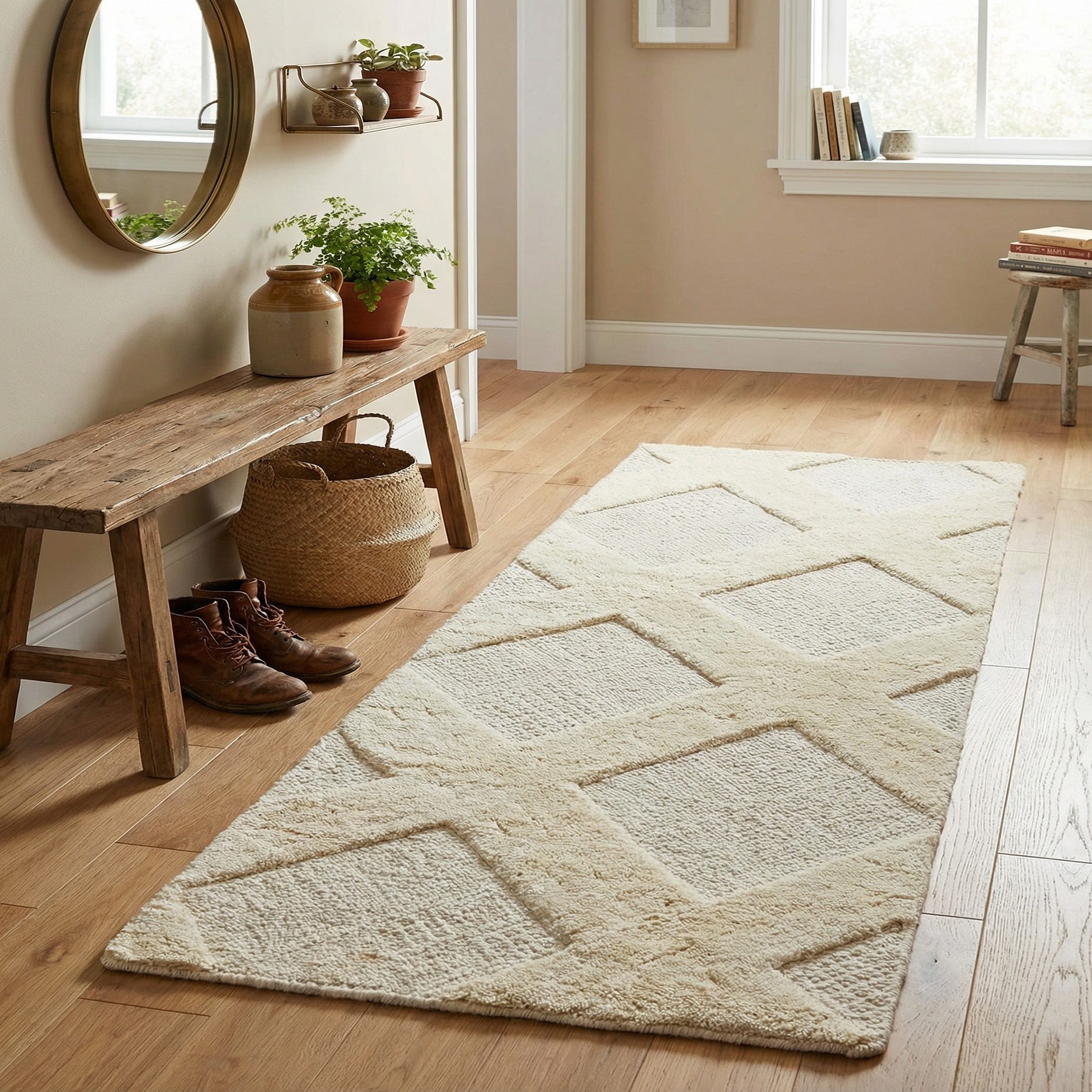 This neutral palette and clean geometric layout work well in narrow, transitional spaces where texture matters—hallways, entryways, or alongside a bed as a soft landing. It pairs naturally with light woods and linen upholstery in Scandinavian or modern farmhouse interiors, and it can also soften sleek, minimalist or contemporary spaces when layered with matte metal accents and simple, tonal furniture.