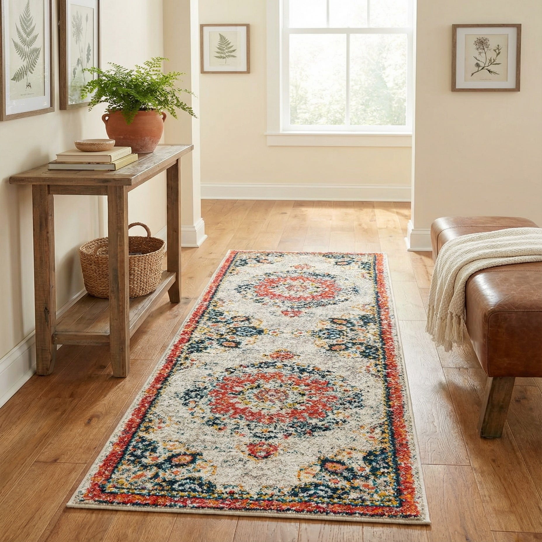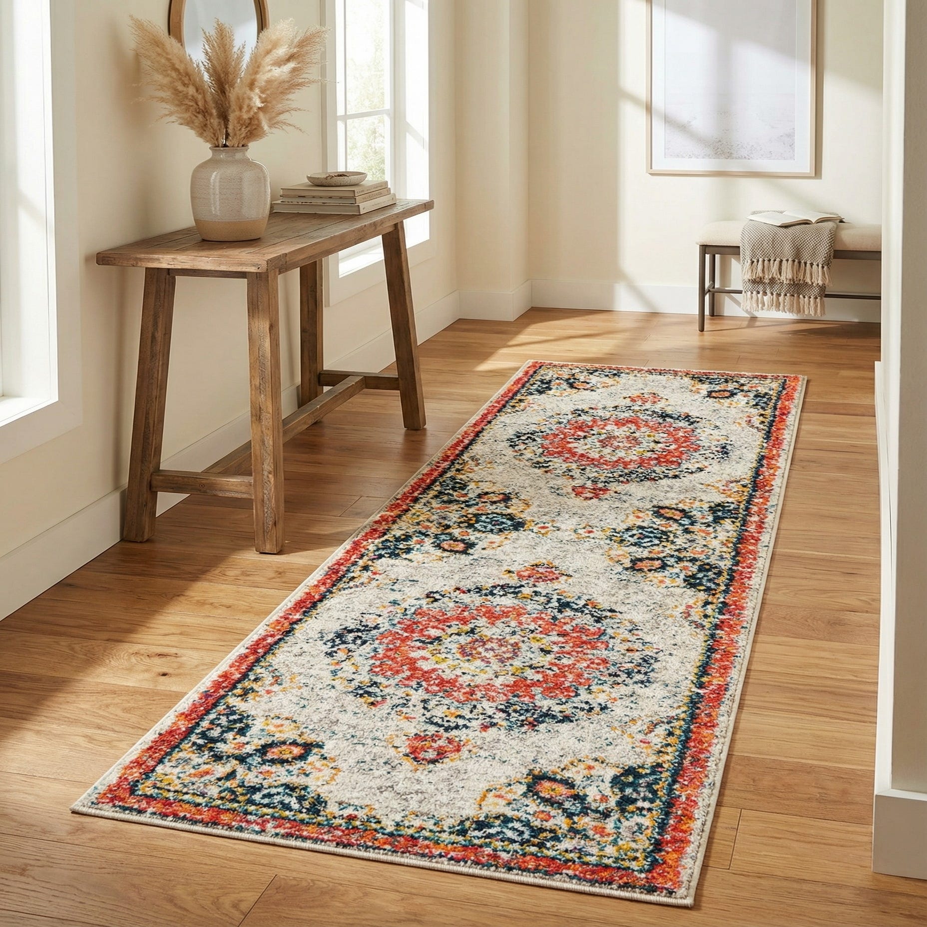 Machine made from 100% polypropylene, the rug has a soft, slightly plush cut pile that feels comfortable underfoot and shows the textured, slightly distressed surface clearly. It works well in narrow or transitional spaces such as entryways, hallways, or alongside a kitchen runner run; it also pairs nicely with light wood floors, white or neutral walls, and mixed-metal accents. Style pairings include relaxed bohemian rooms with layered textiles, a colorful transitional living space that balances modern and traditional pieces, or a bright, airy hallway anchored by a simple wood bench and woven baskets.