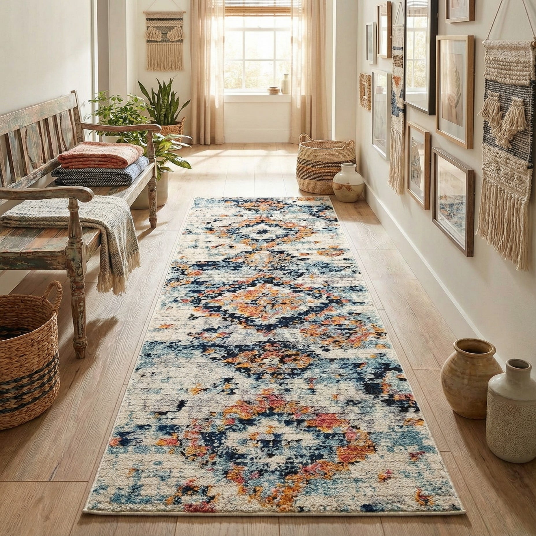 This runner works well in narrow, high-traffic areas—hallways, entryways, or alongside a kitchen island—where its palette can brighten a passage without overwhelming surrounding finishes. Pair it with light-wood floors and linen upholstery for an airy, coastal-adjacent look, add navy accents and brass hardware for a tailored transitional space, or layer it with woven textiles and mixed metals in a relaxed, bohemian scheme.