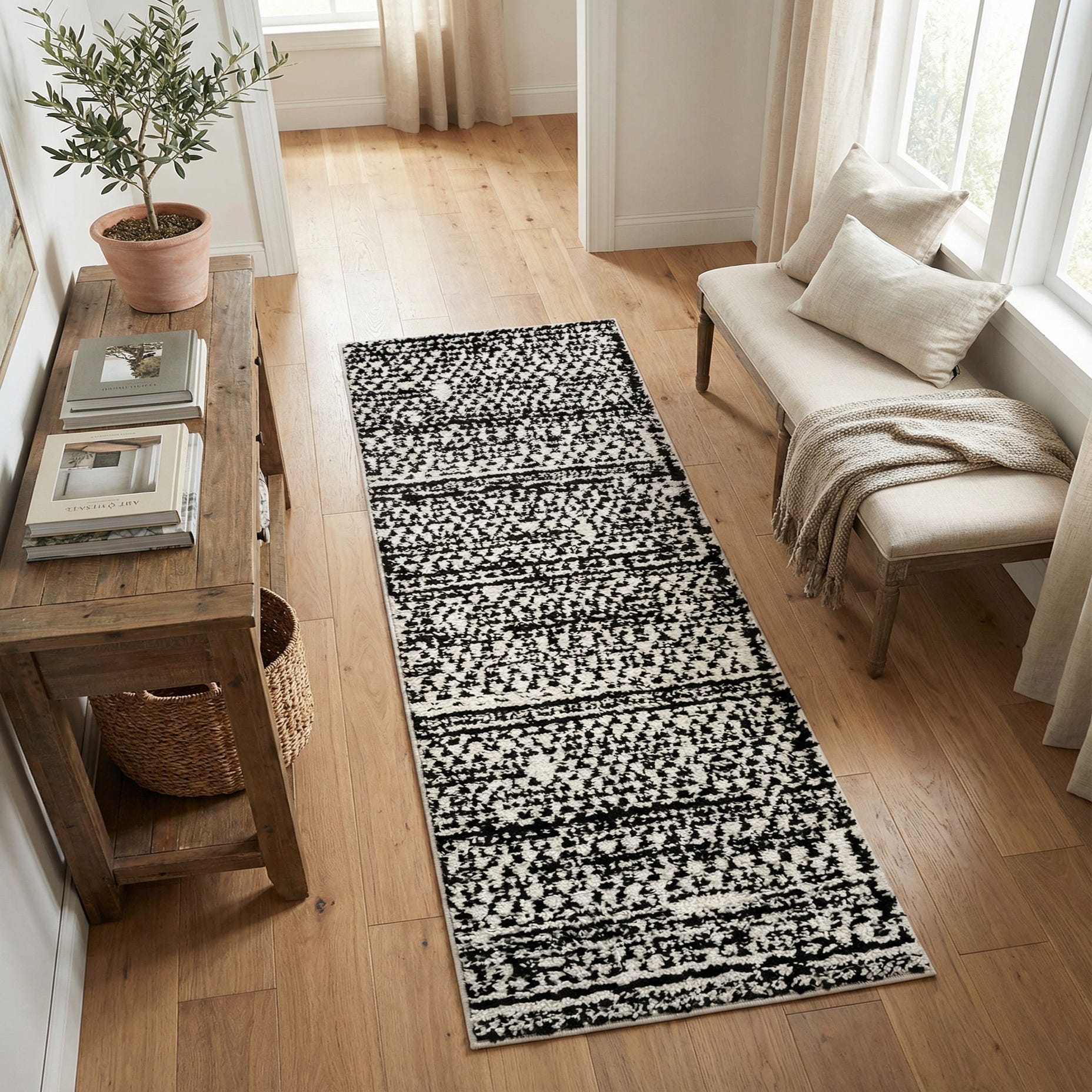 This runner works well in narrow spaces that need visual interest without heavy color, such as hallways, entryways, or alongside a bed. Pair it with light wood floors and black metal accents for a modern Scandinavian feel, layer it over a larger neutral rug in a living area for added depth, or use it to anchor a minimalist kitchen with white cabinets and dark hardware. The monochrome palette makes it easy to coordinate with both warm and cool color schemes.