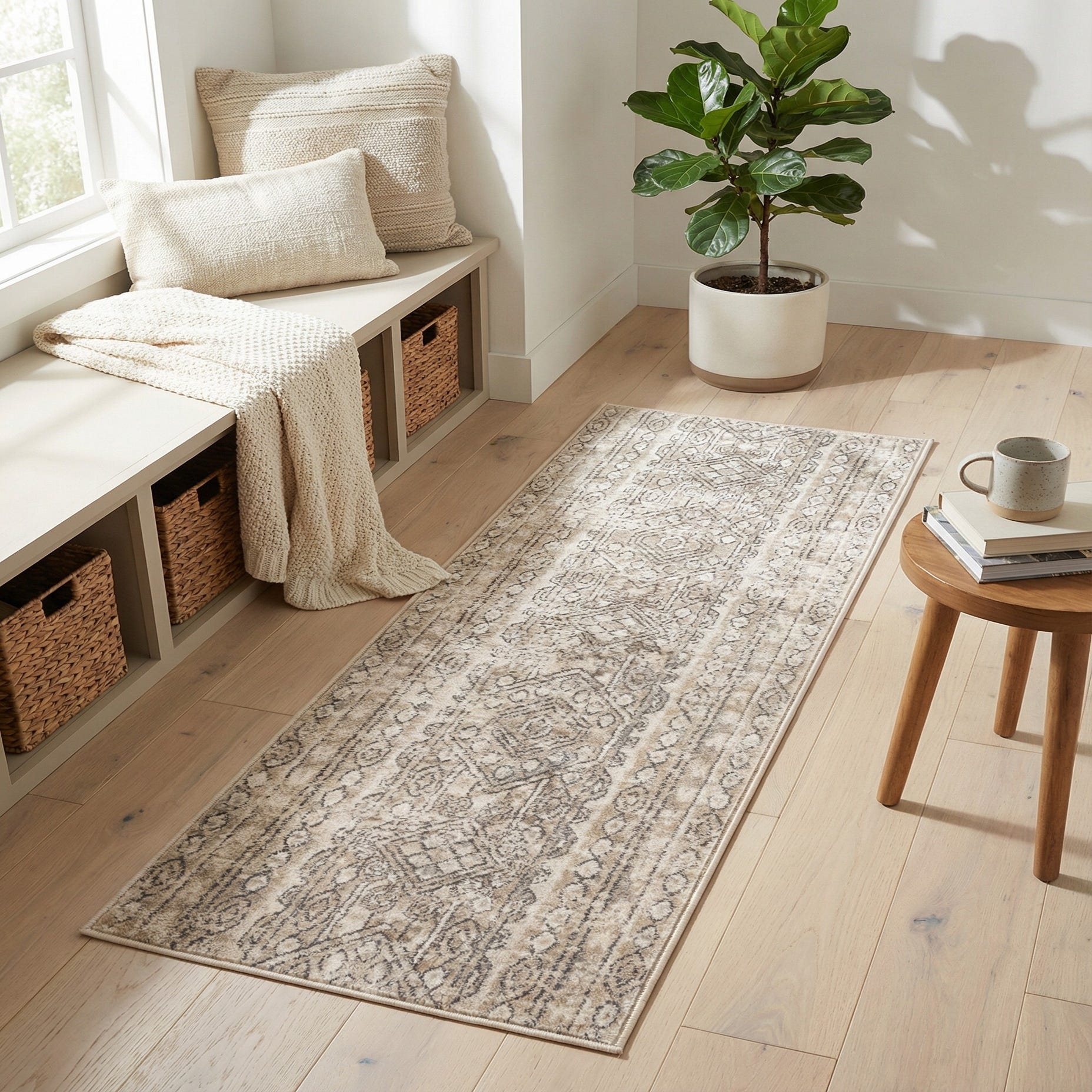 Machine-made from 85% polypropylene and 15% polyester, this runner has an ivory ground that showcases a softly worn medallion-and-border pattern in gray and light brown. The design blends geometric diamond motifs with elongated scrolls and subtle distressing for a vintage-inspired, transitional look. The pile feels soft and resilient underfoot, with a slight sheen that adds dimension to the pattern without overpowering a space.