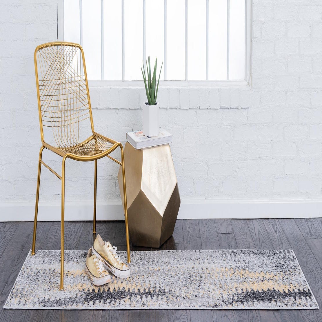 An abstract, linear pattern plays across an ivory field, where mottled bands of gray and pops of yellow create a lively, tonal contrast. The design reads like a softened ikat or soundwave—irregular edges and speckled shading give the runner visual depth without heavy repetition, so it anchors a space without overwhelming it. Machine-made from 100% polypropylene, the surface has a low-profile, slightly nubby texture that feels firm underfoot while still offering a bit of tactile interest.