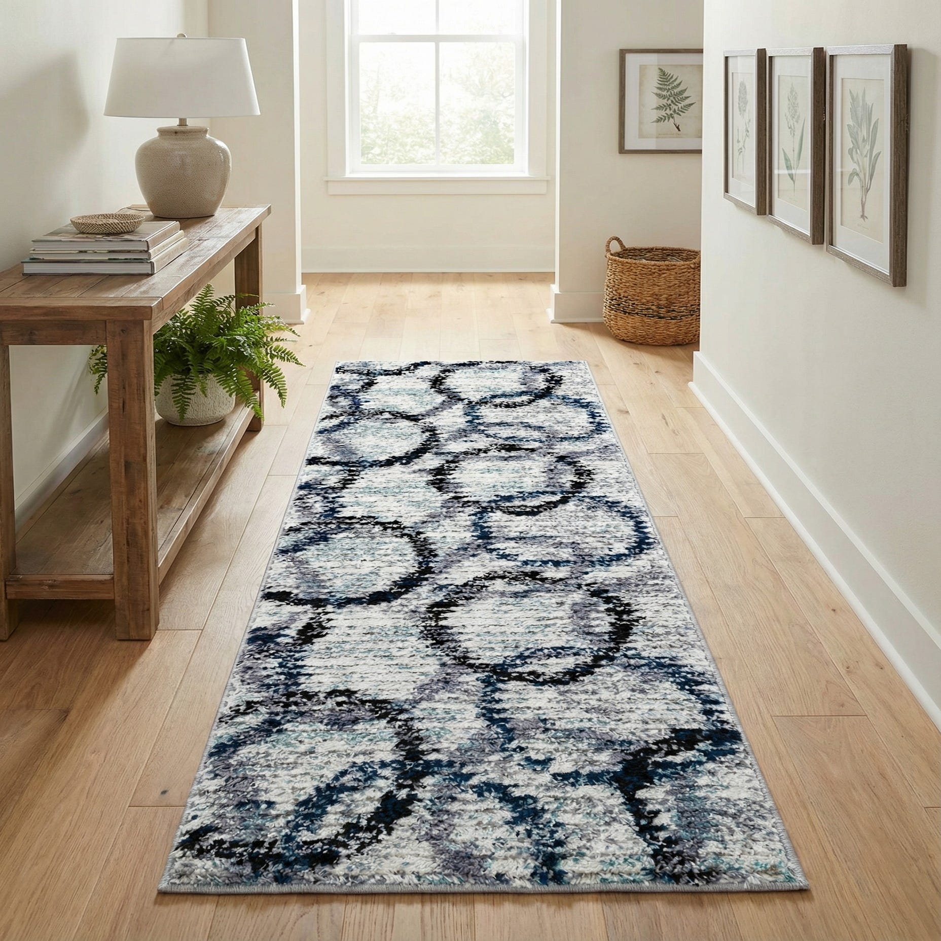 This runner suits contemporary and transitional interiors that favor cool-toned palettes—think gray sofas with navy accents, pale wood floors, or coastal-inspired rooms where light blues and ivories dominate. Place it in a hallway or entry to add visual interest, layer it along a kitchen or bathroom corridor for a softer step, or use it beside a bed to bring a cool, calming touch to the bedside area.