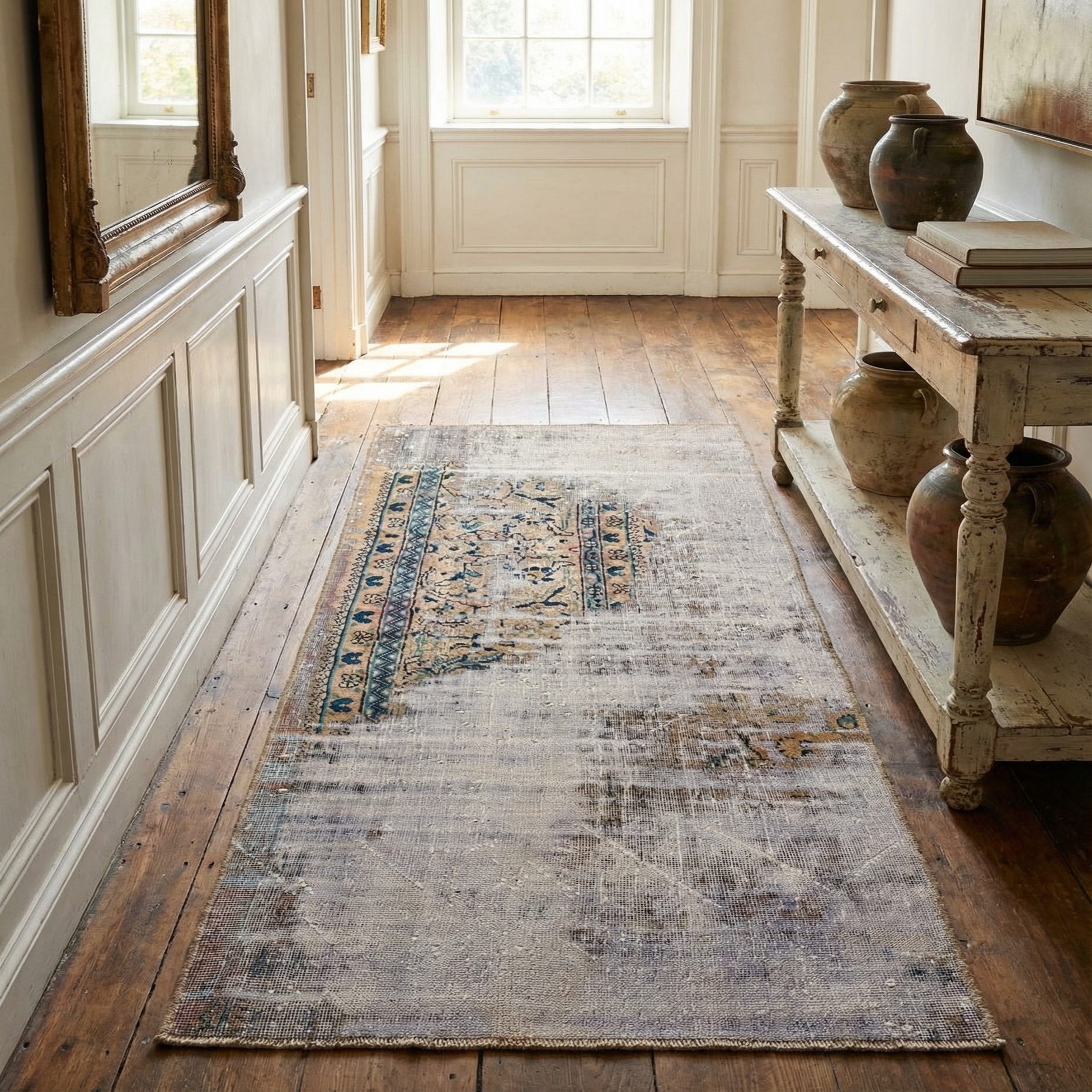 A 6 ft runner rug with a faded ivory and cream base, featuring distressed traditional Persian patterns in muted browns and blues.