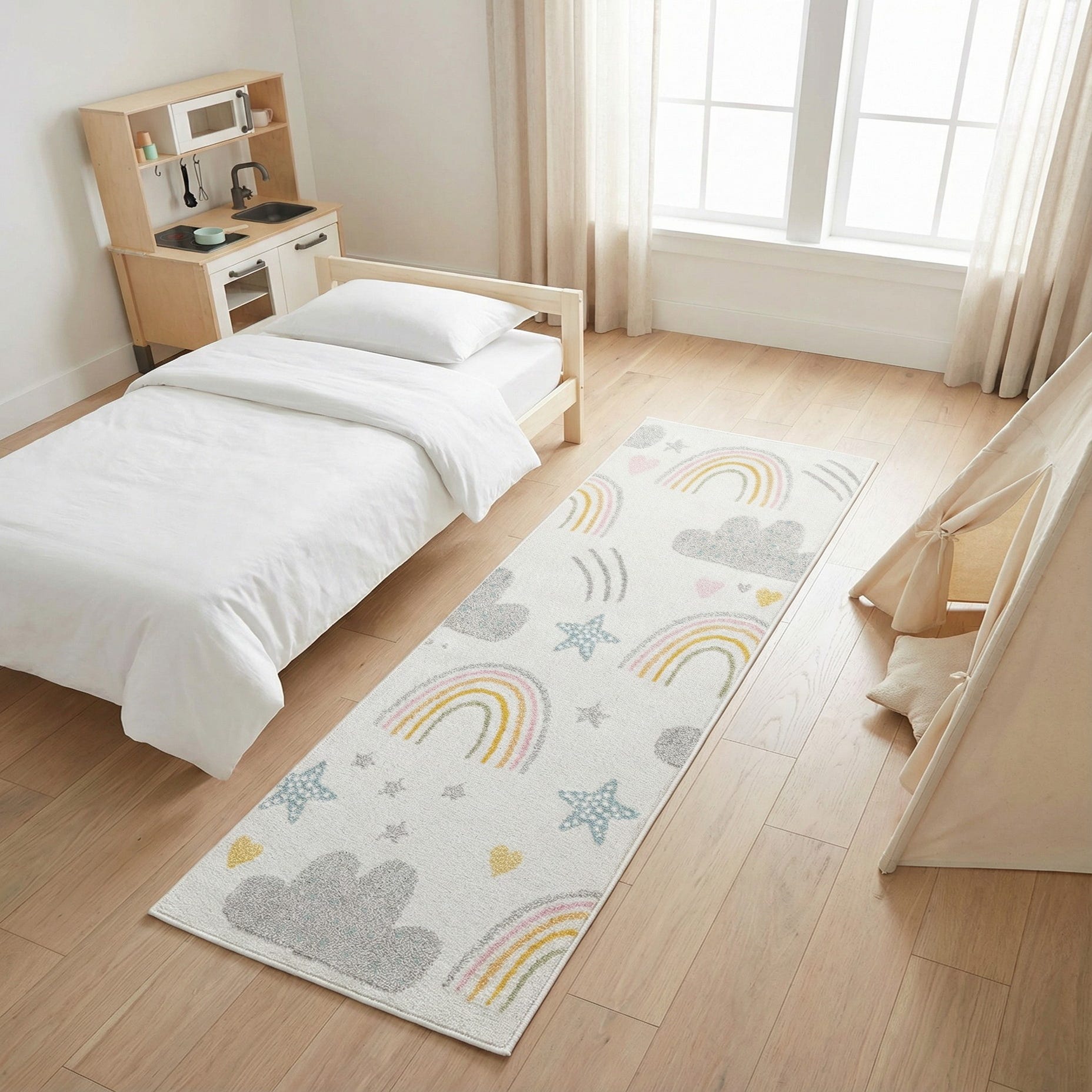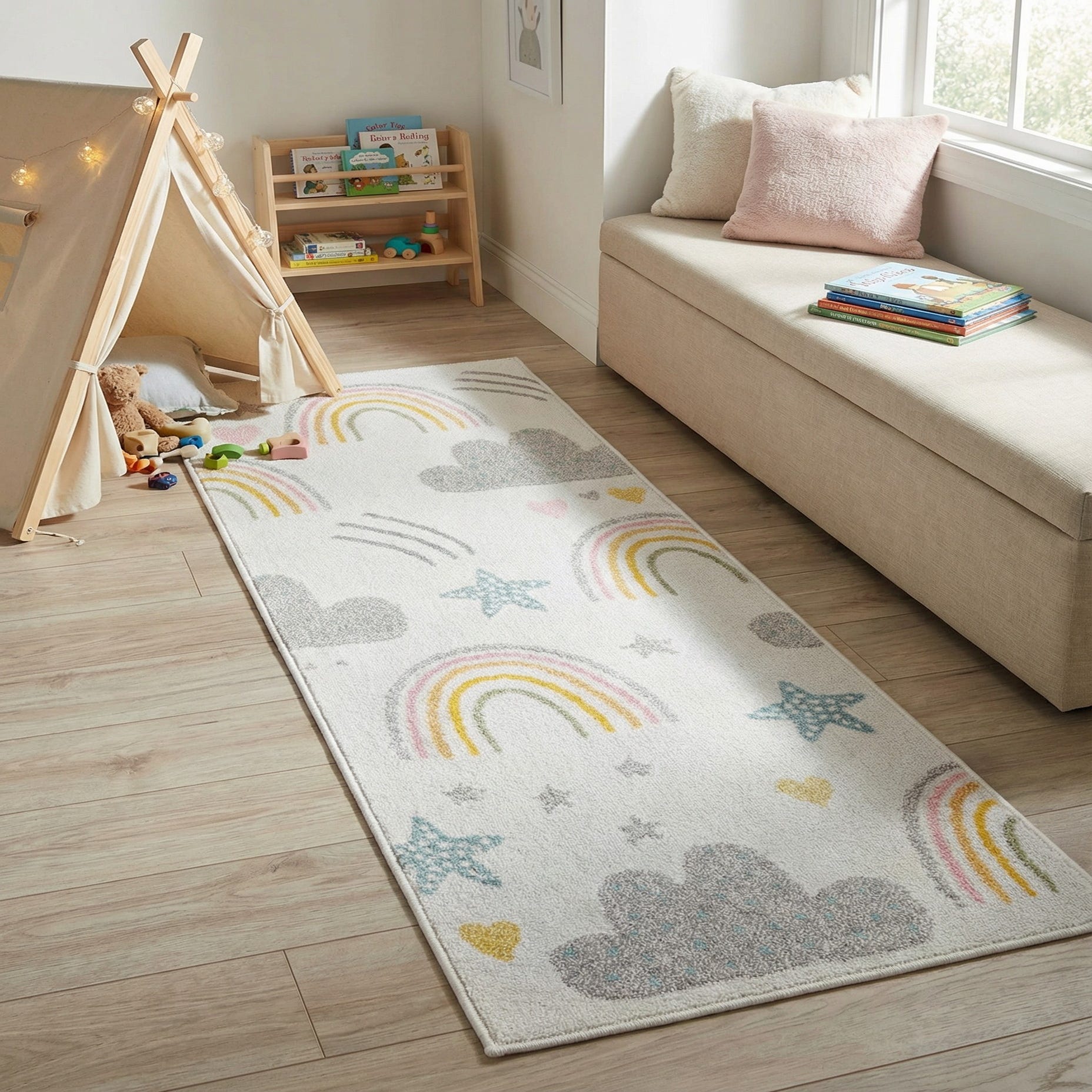 A soft ivory ground sets the stage for a playful pattern of rainbows, gray cloud motifs, tiny stars and scattered pink hearts with pops of sunny yellow. The gently sketched lines and muted palette give the design a whimsical, modern look that reads fresh without feeling fussy. Machine made from 100% polypropylene, the rug's low-profile pile has a smooth, slightly plush hand that holds crisp pattern detail across the surface.