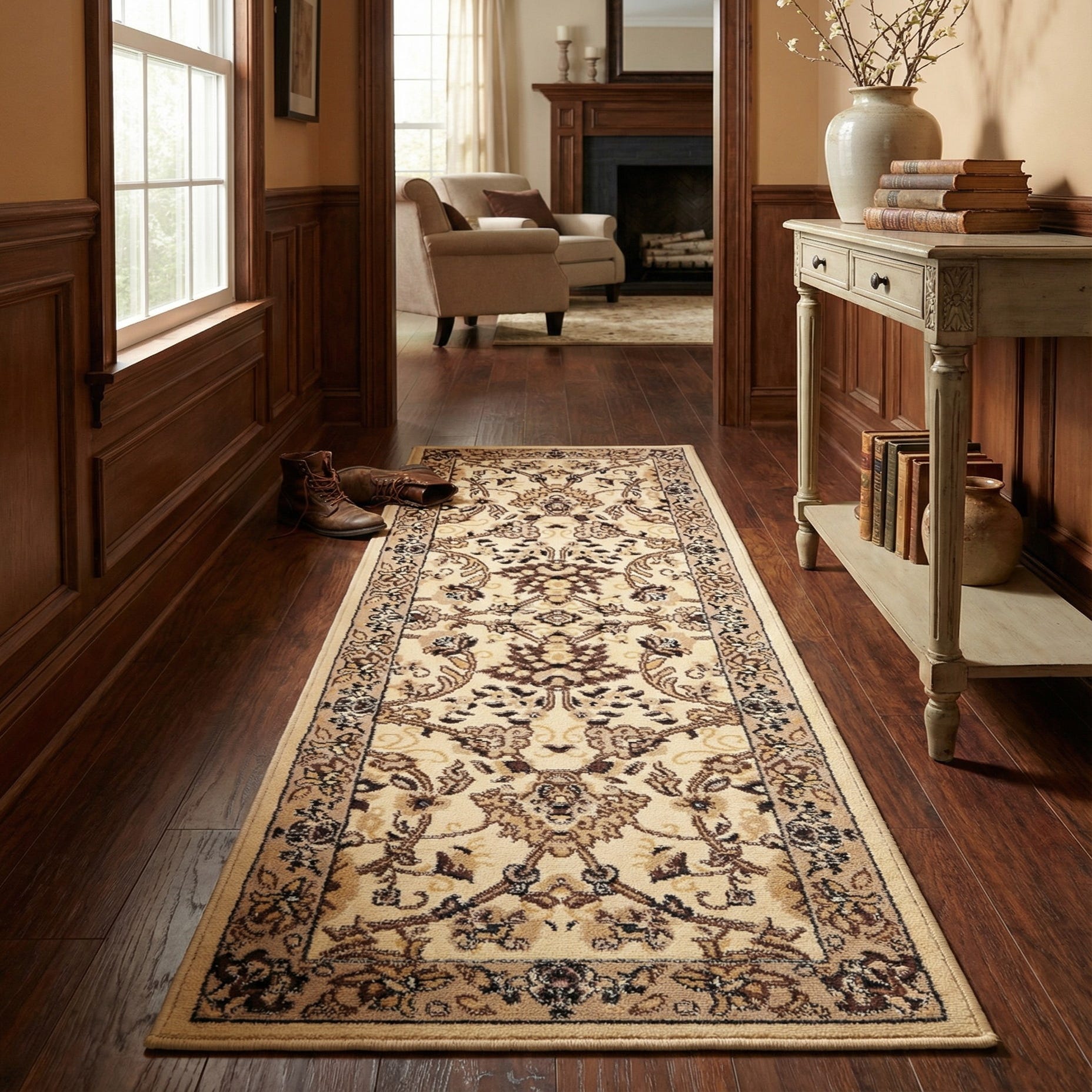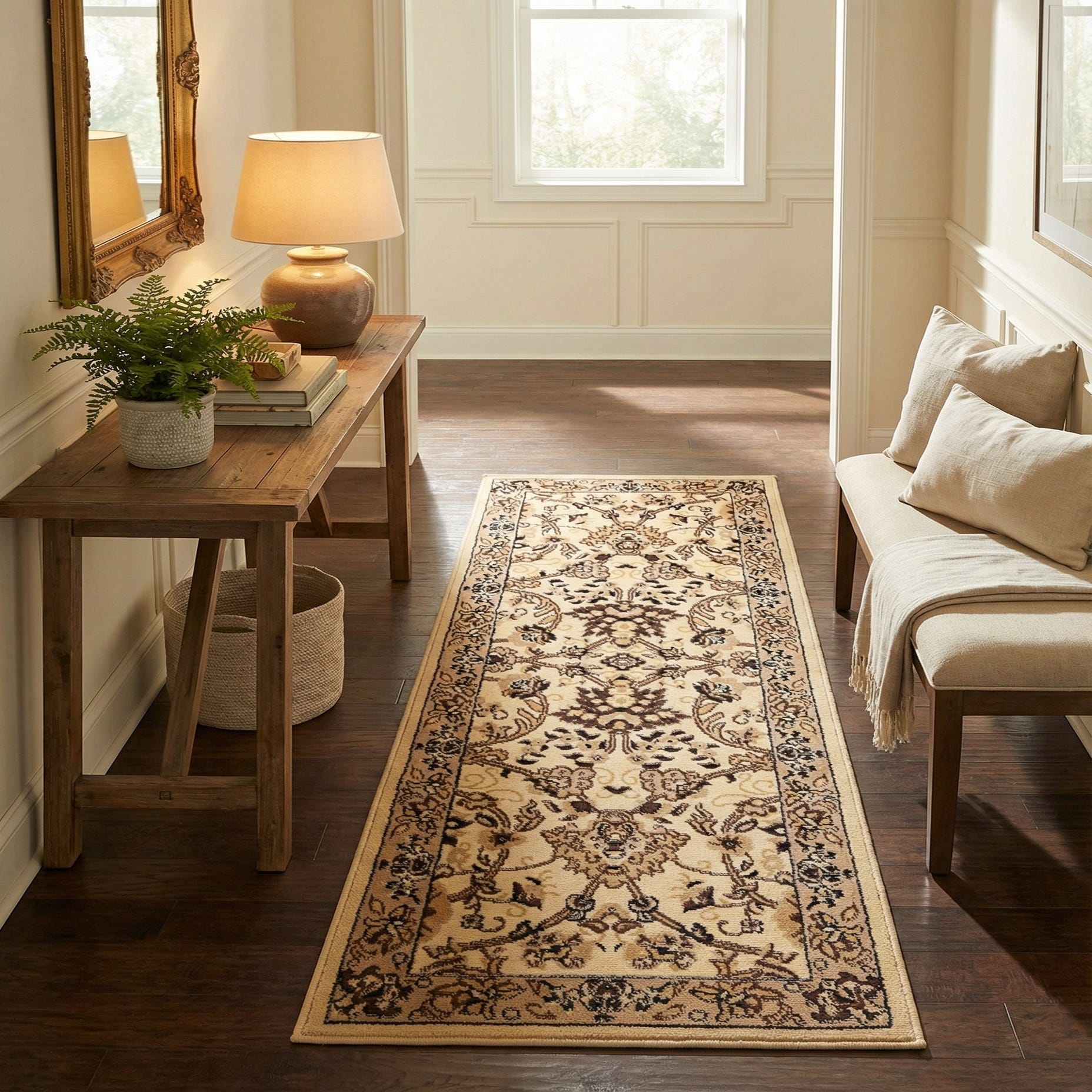 The neutral palette and timeless motif suit a range of interiors: place it in a hallway or entry to add warmth and visual interest, run it down a kitchen galley to soften hard floors, or use it along the side of a bed to anchor bedside furnishings. It pairs particularly well with warm wood tones, leather or linen upholstery, and metal finishes in aged brass or oil-rubbed bronze.