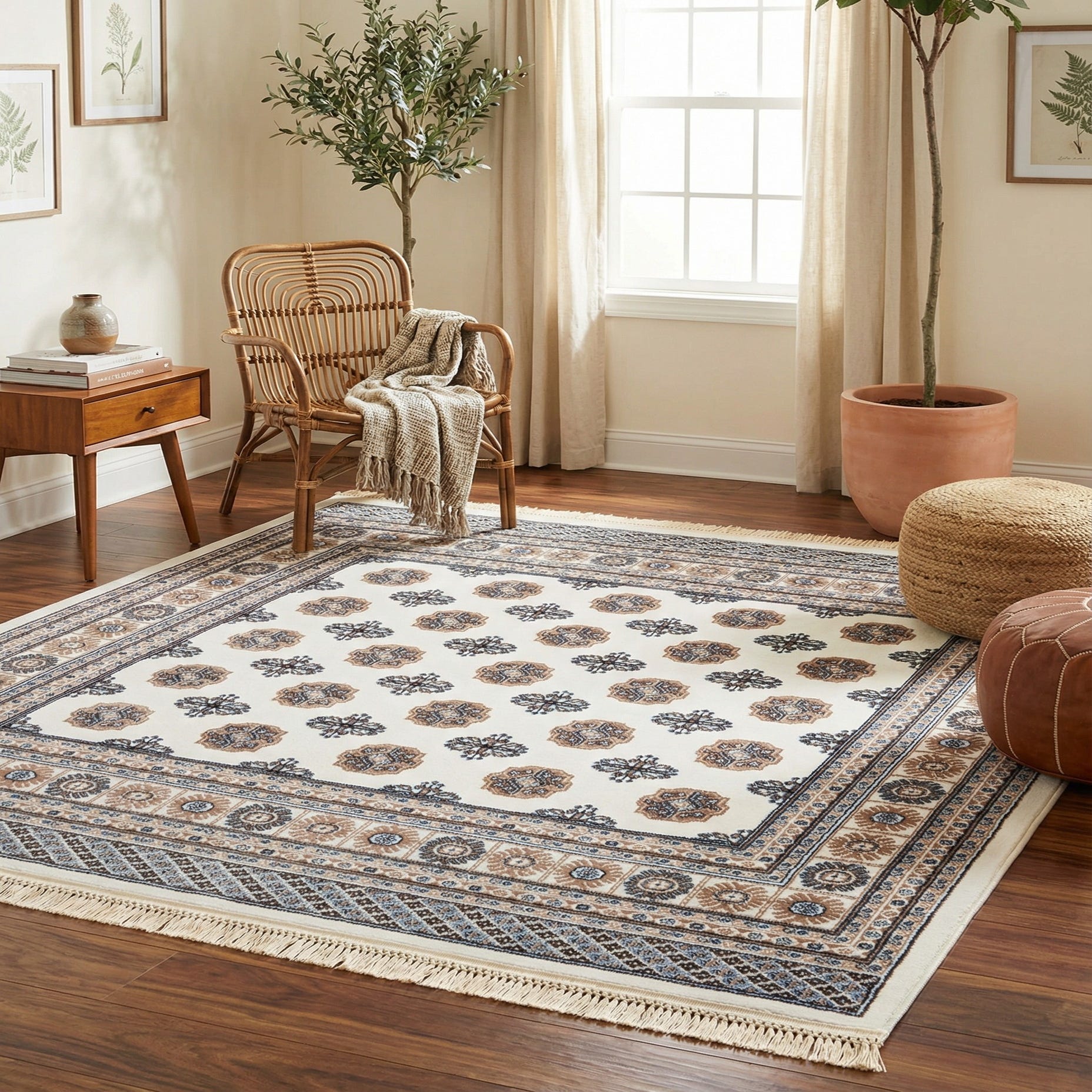The Bokhara Collection offers a 6 Ft Square rug that is machine woven from 100% polypropylene, ensuring durability and stain resistance. This rug presents a central field of traditional geometric motifs enclosed by ornamental borders. The color palette includes an ivory background accompanied by rich navy blue and light brown accents, creating a visually cohesive and versatile design. The texture of the rug is smooth, crafted to provide a pleasant underfoot experience while maintaining ease of maintenance.