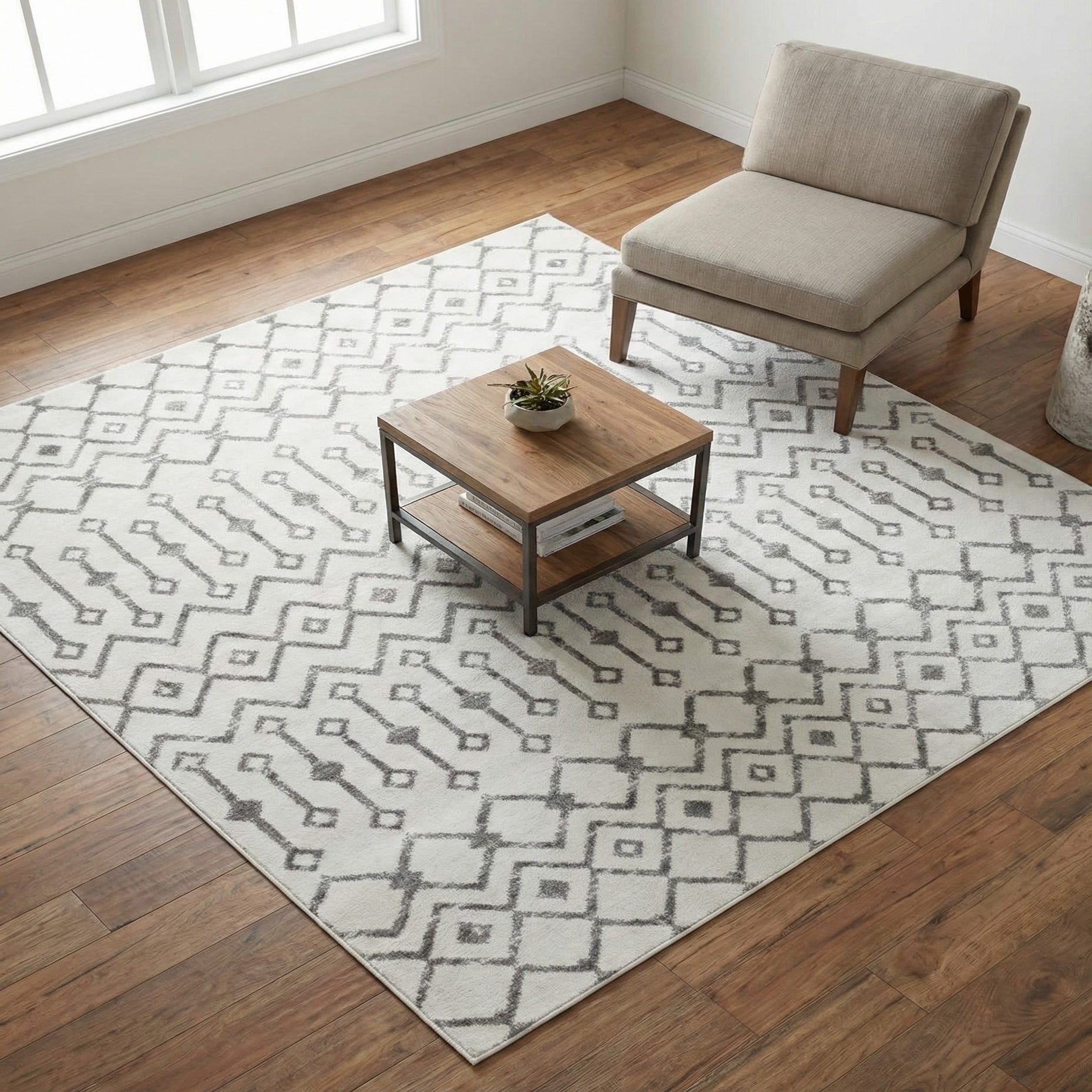 Machine-made of 100% polypropylene, the rug has a low-profile pile that feels soft underfoot while maintaining a flat appearance that layers well in a room. Its neutral palette and balanced pattern make it ideal for living rooms and bedrooms where a calm foundation is needed, in entryways to anchor furniture without overwhelming a small space, or under a round dining table to add quiet geometric interest. It pairs especially well with light wood finishes, painted white or gray furniture, and clean-lined modern or transitional decor.