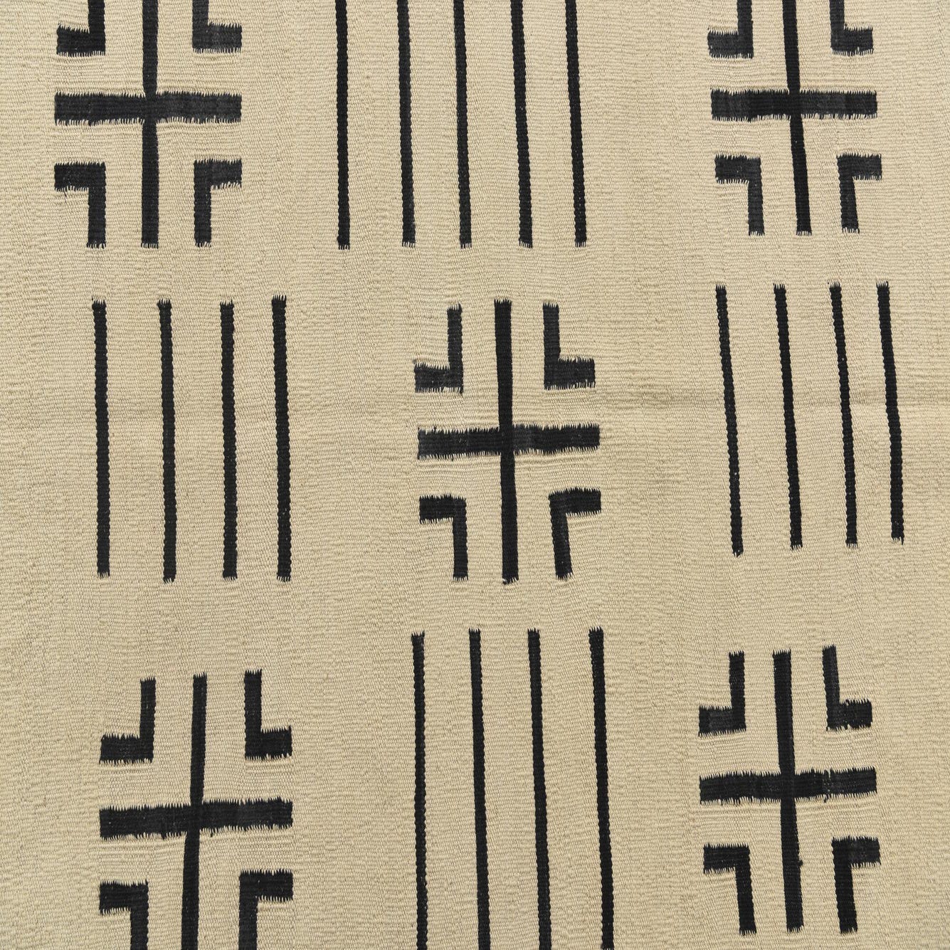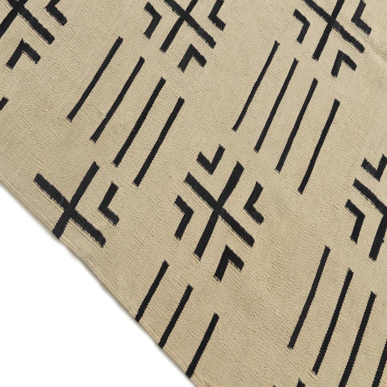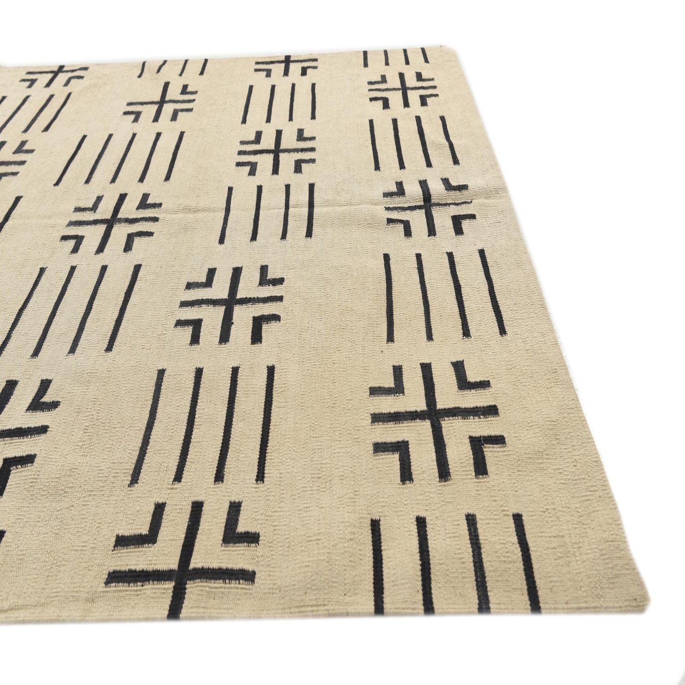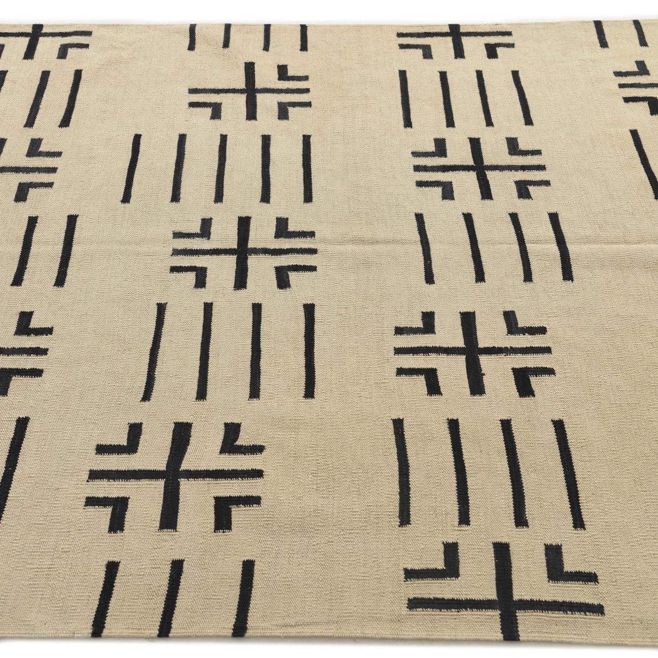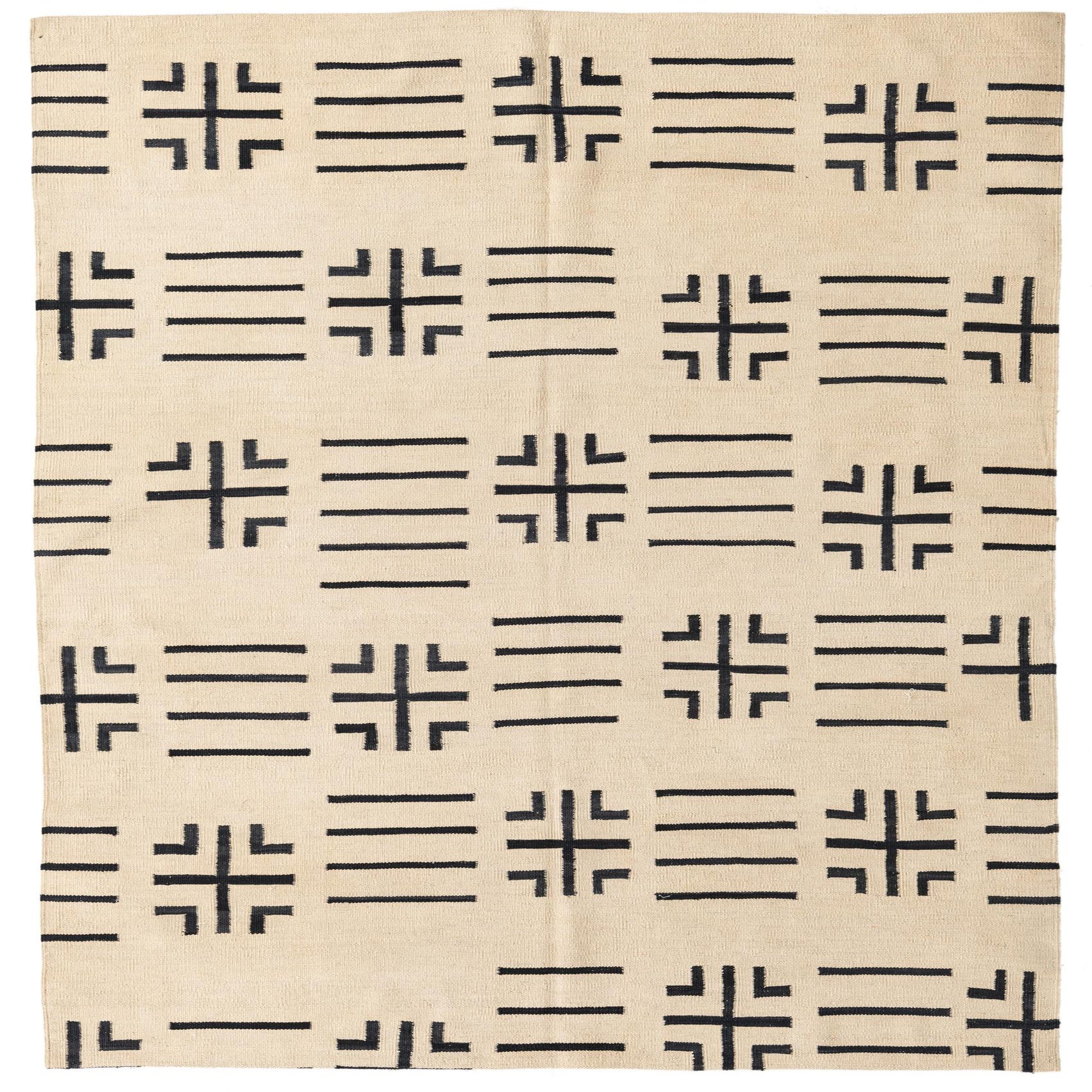A 5' 4 x 6' 6 square ivory wool rug with a repeating black tribal geometric pattern, featuring horizontal lines and cross shapes.