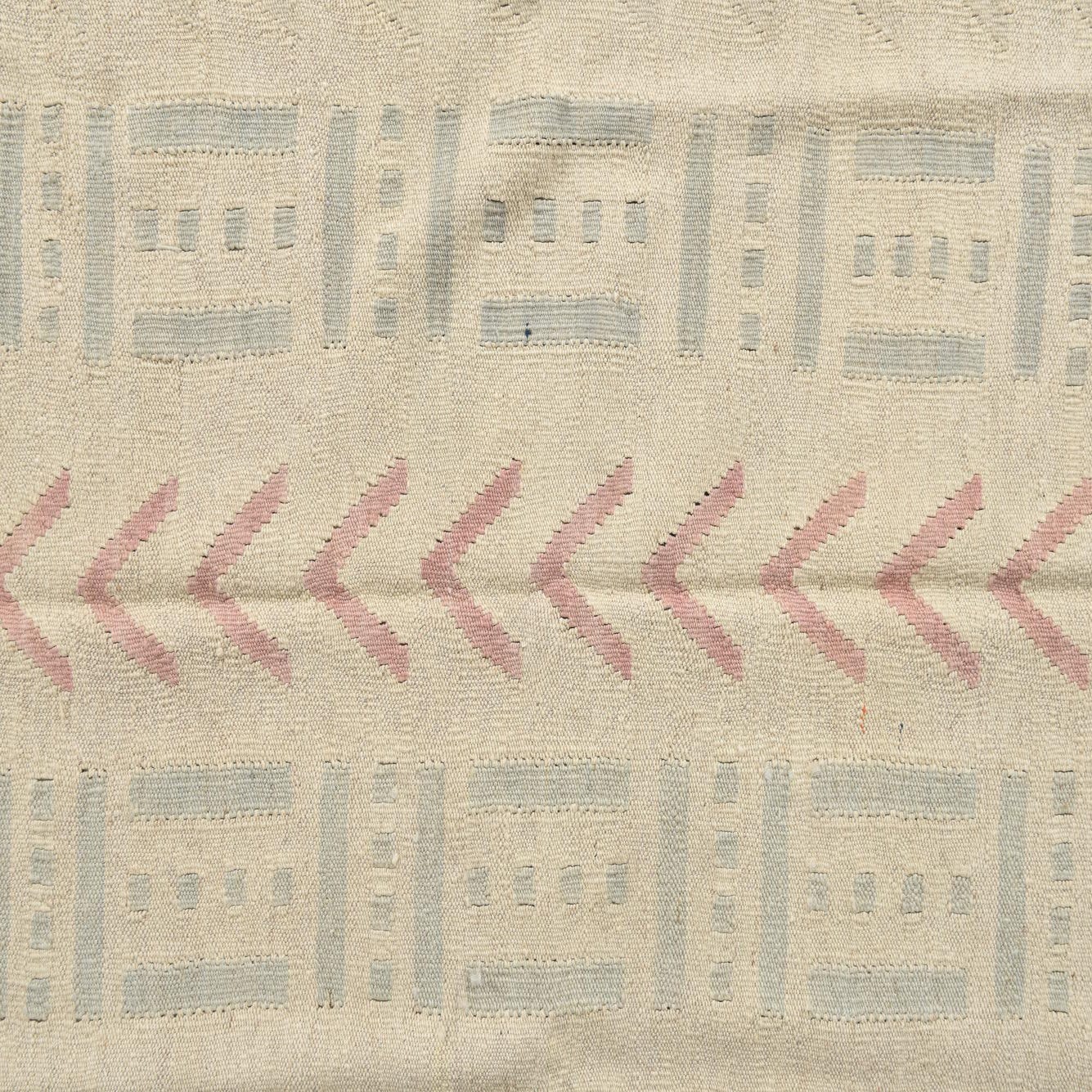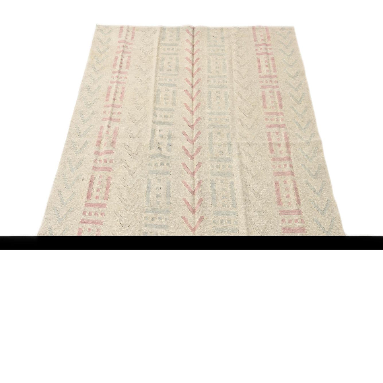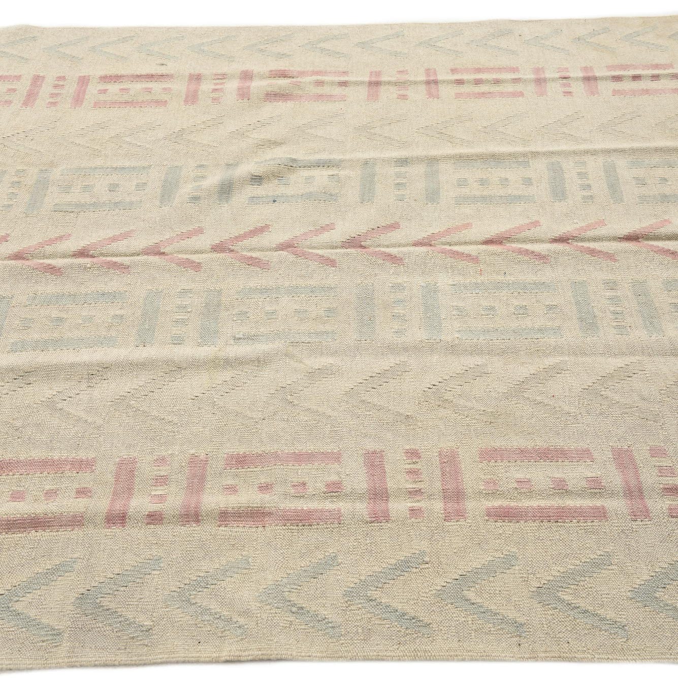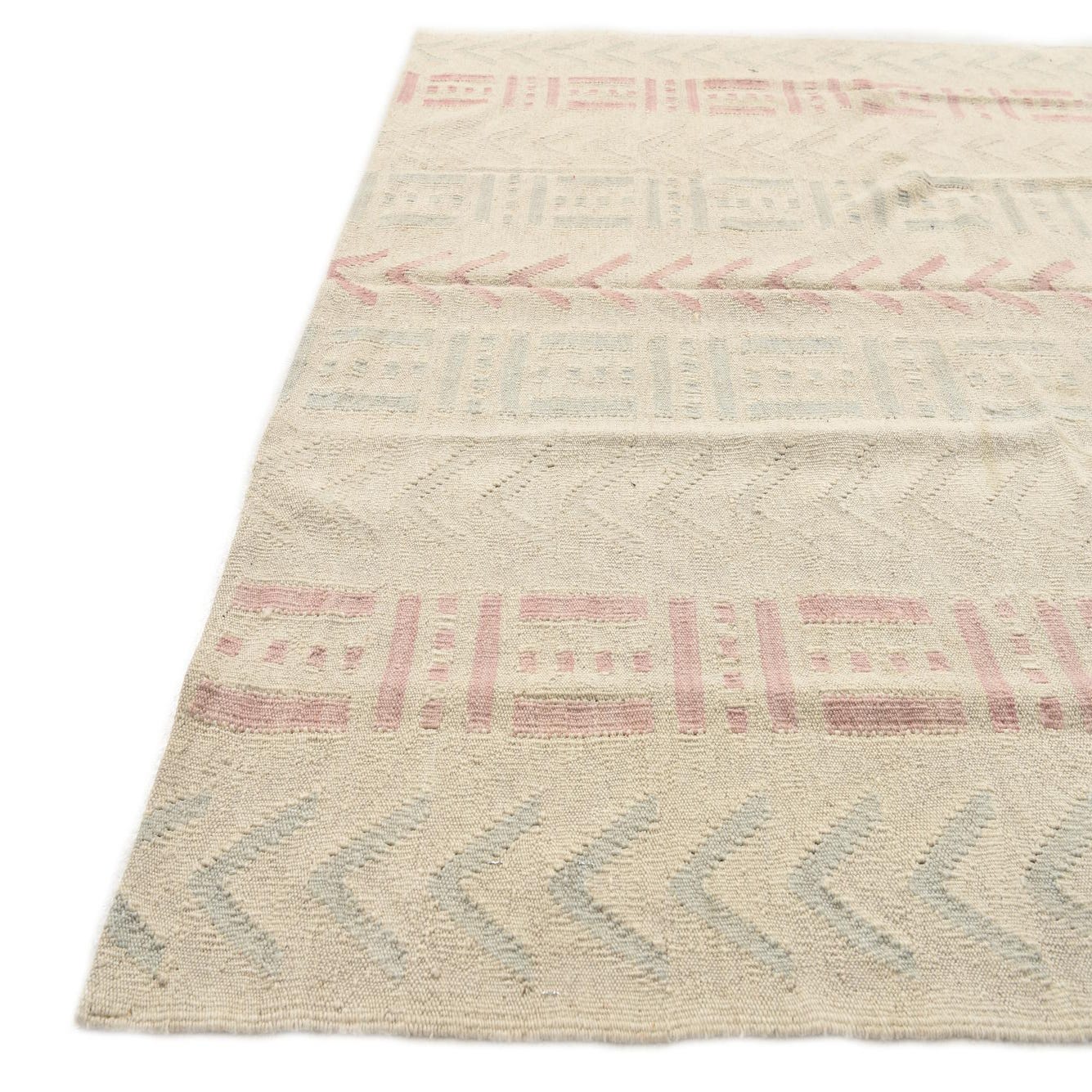 A 5' 2 x 5' 11 square ivory wool flatweave rug with a modern tribal pattern in soft pink and light blue.