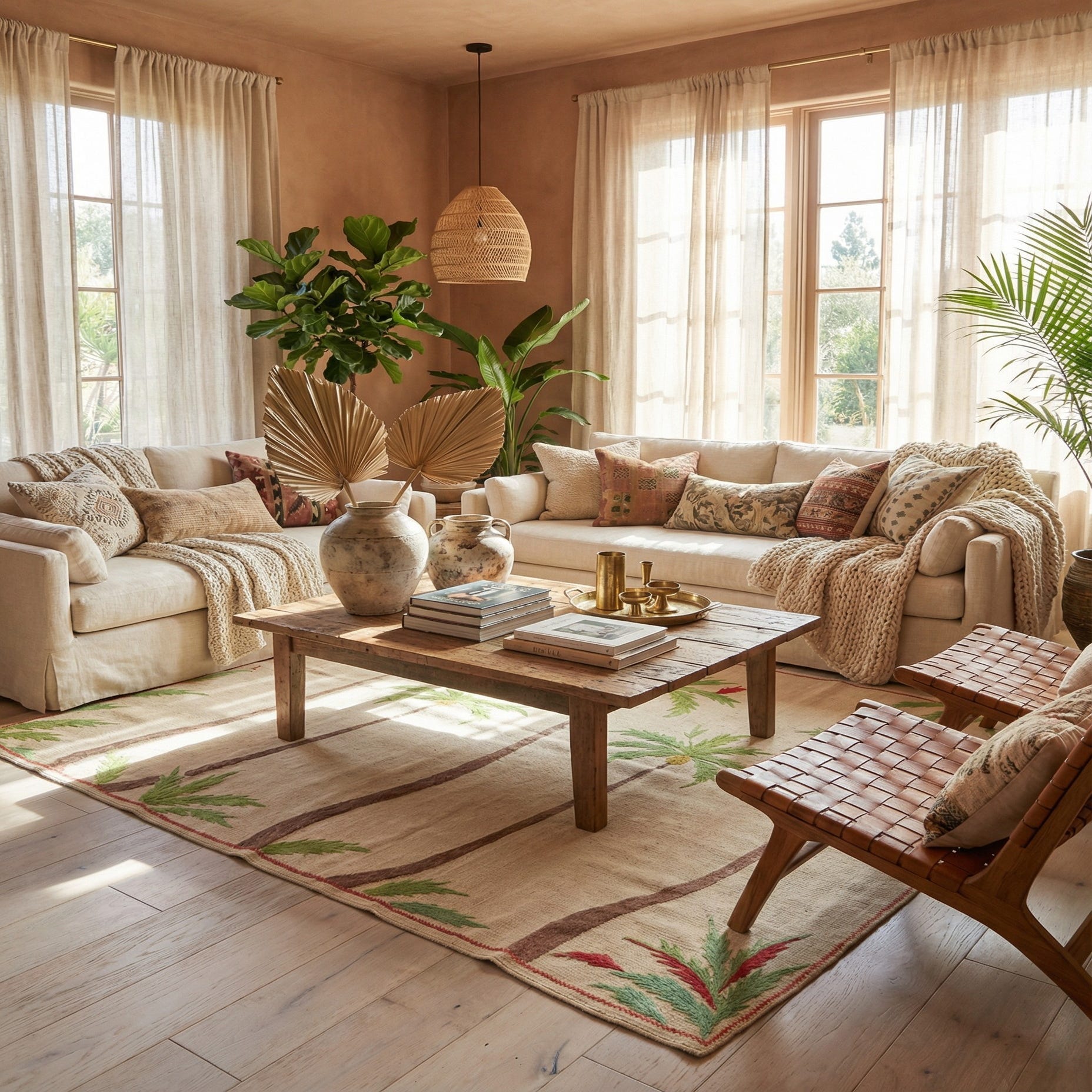 This Kilim Suzani rug will integrate seamlessly into a variety of interior design frameworks. Its earthy tones and natural motif make it an ideal choice for rustic, bohemian, or traditional decors, bringing a grounded and serene element to living rooms, home offices, and enclosed patios. Additionally, it could serve as a complementary focal point in minimalist or Scandinavian settings, where its texture and pattern enrich a space with understated elegance.