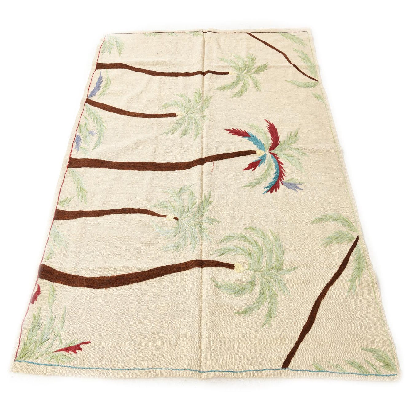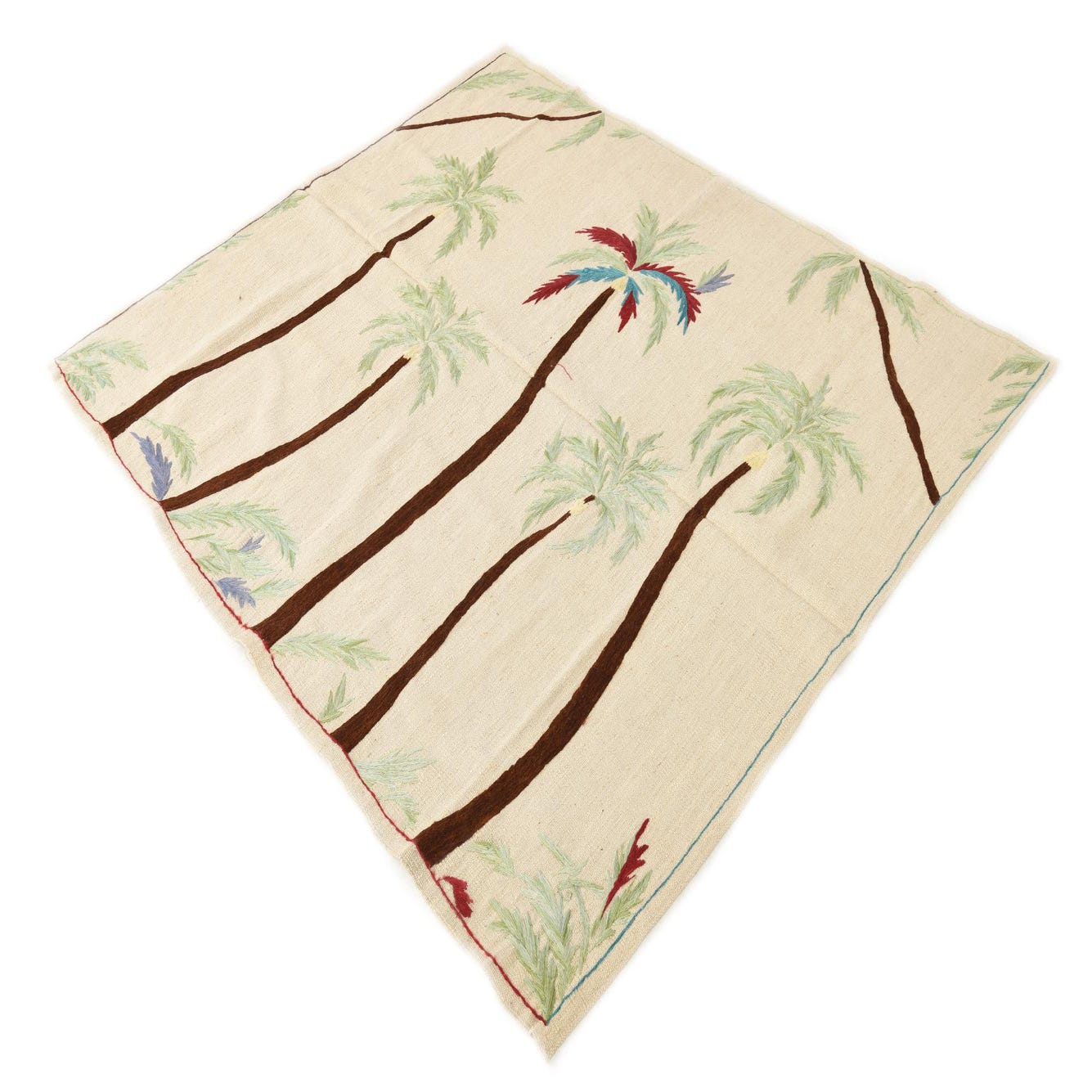 A square ivory wool rug featuring a vibrant, modern tribal pattern of palm trees with green, blue, and red fronds.