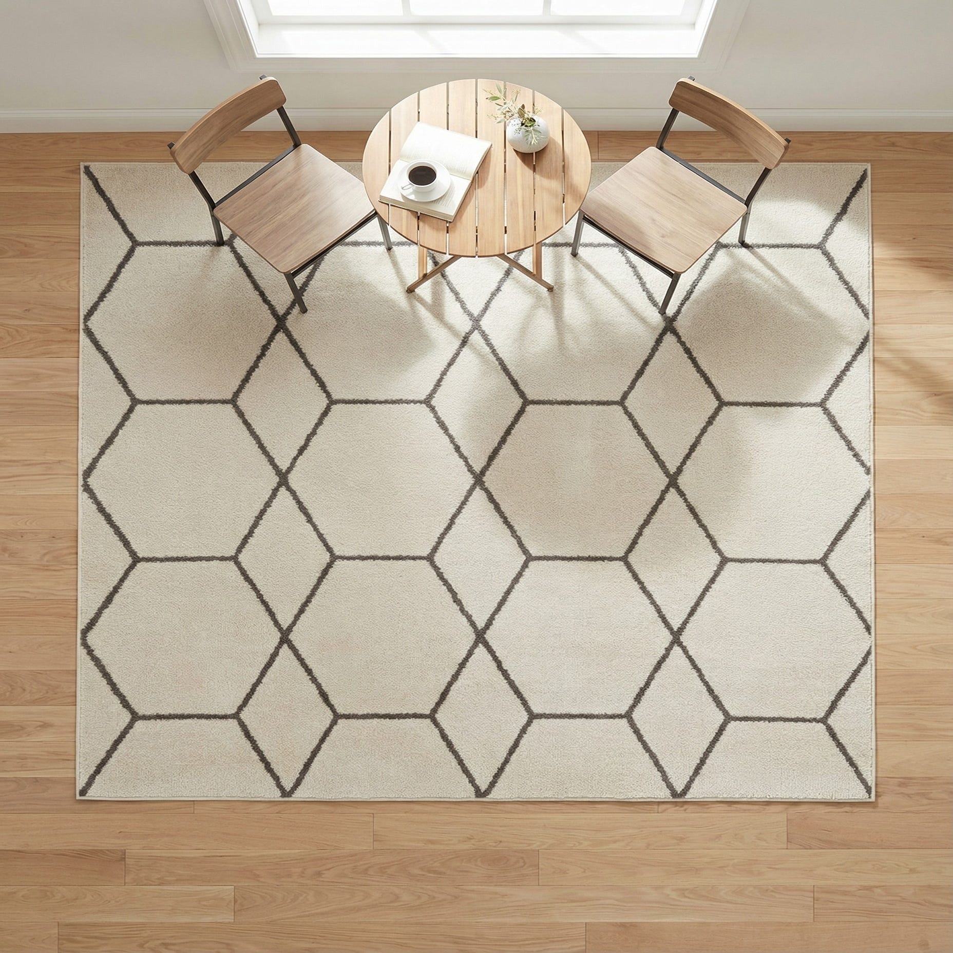 A clean geometric lattice of gray lines lays across an ivory field in a repeating hexagon motif. The pattern is crisp but not busy, with the gray outlines slightly raised against a soft cut pile so you can feel subtle dimensionality underfoot. Machine-made from 100% polypropylene, the rug has a consistent low-to-medium pile that provides a cushioned, velvety surface and holds its shape across the square format.