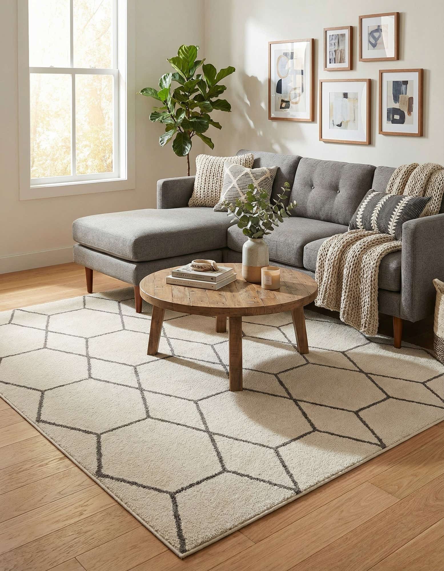 This neutral ivory-and-gray palette pairs easily with Scandinavian, modern farmhouse, or transitional interiors, and complements warm wood tones, black metal accents, and layered textiles. The square shape works well centered beneath a coffee table, as a grounding element in a bedroom seating area, or under a small dining set to add geometric interest without overwhelming a room.