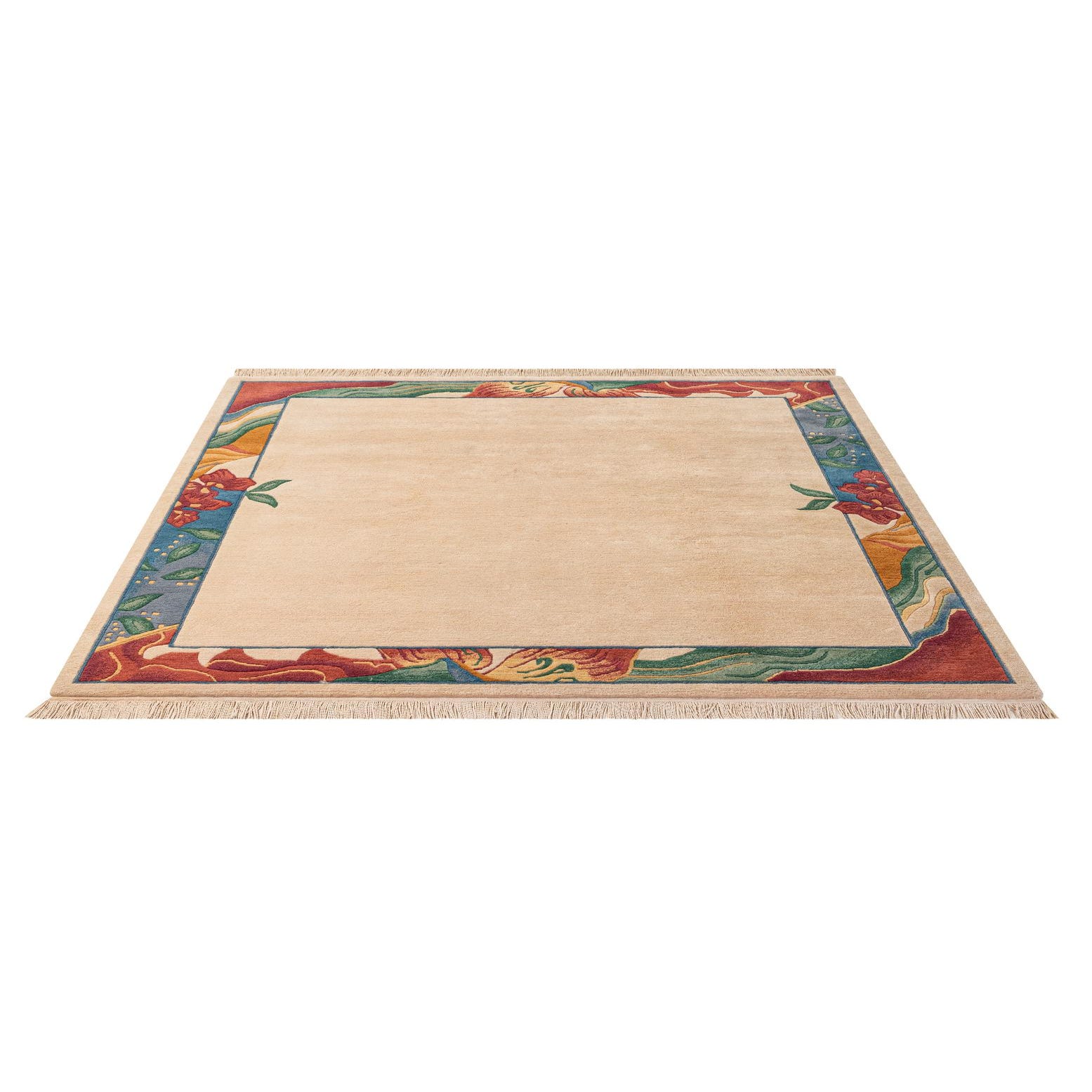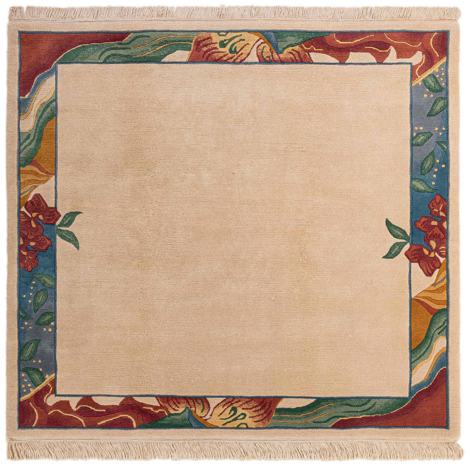 A square ivory wool rug with a vibrant floral and leaf border in shades of red, blue, green, and gold.