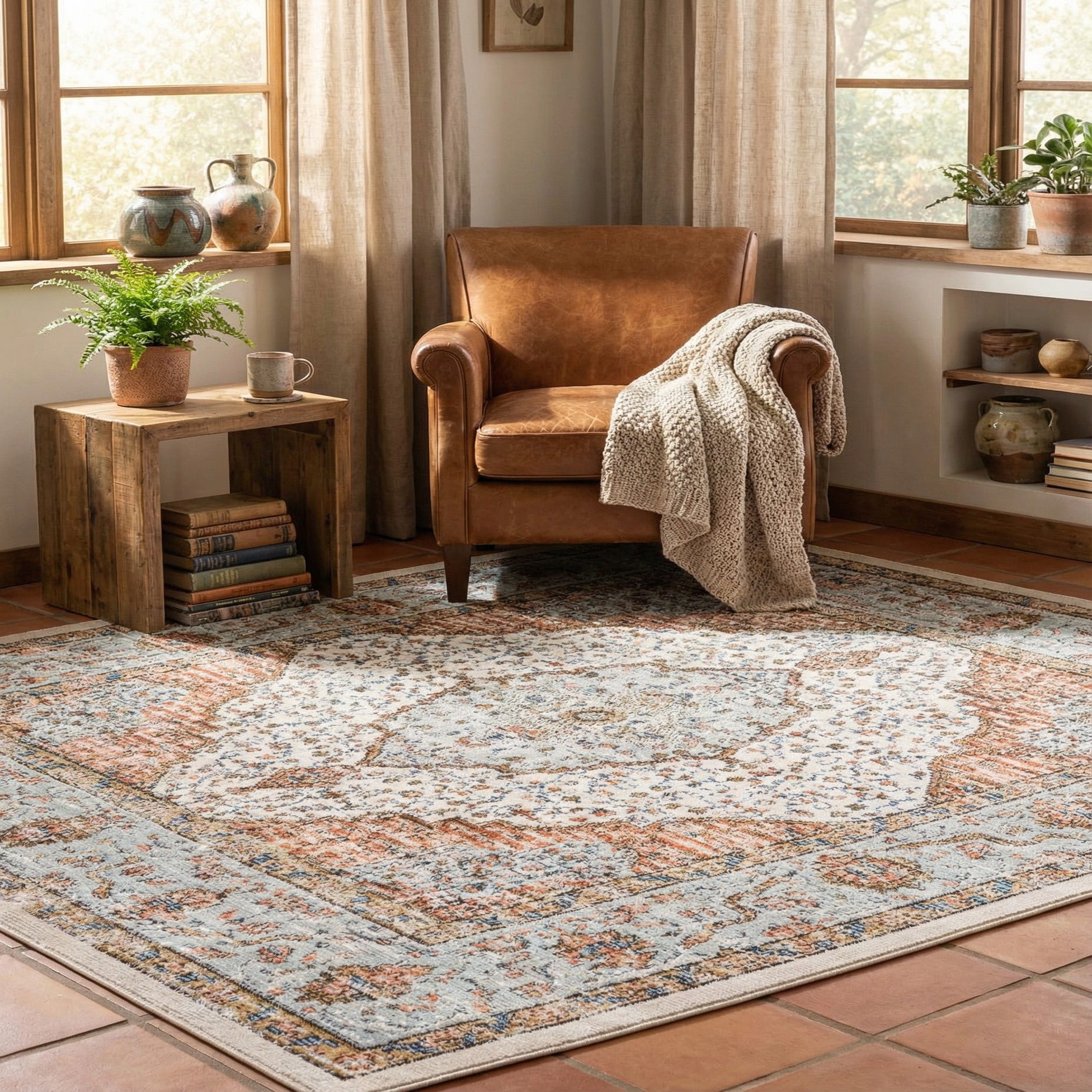 A classic medallion layout with a softly weathered finish, this rug pairs traditional motifs with a relaxed, lived-in look. An ivory background provides a bright, neutral field for a central medallion in light blue and deeper blue tones, while rust red and brown accents trace the floral motifs and ornate border. The palette and distressed detailing create gentle color variation across the surface, so the pattern reads layered rather than flat.