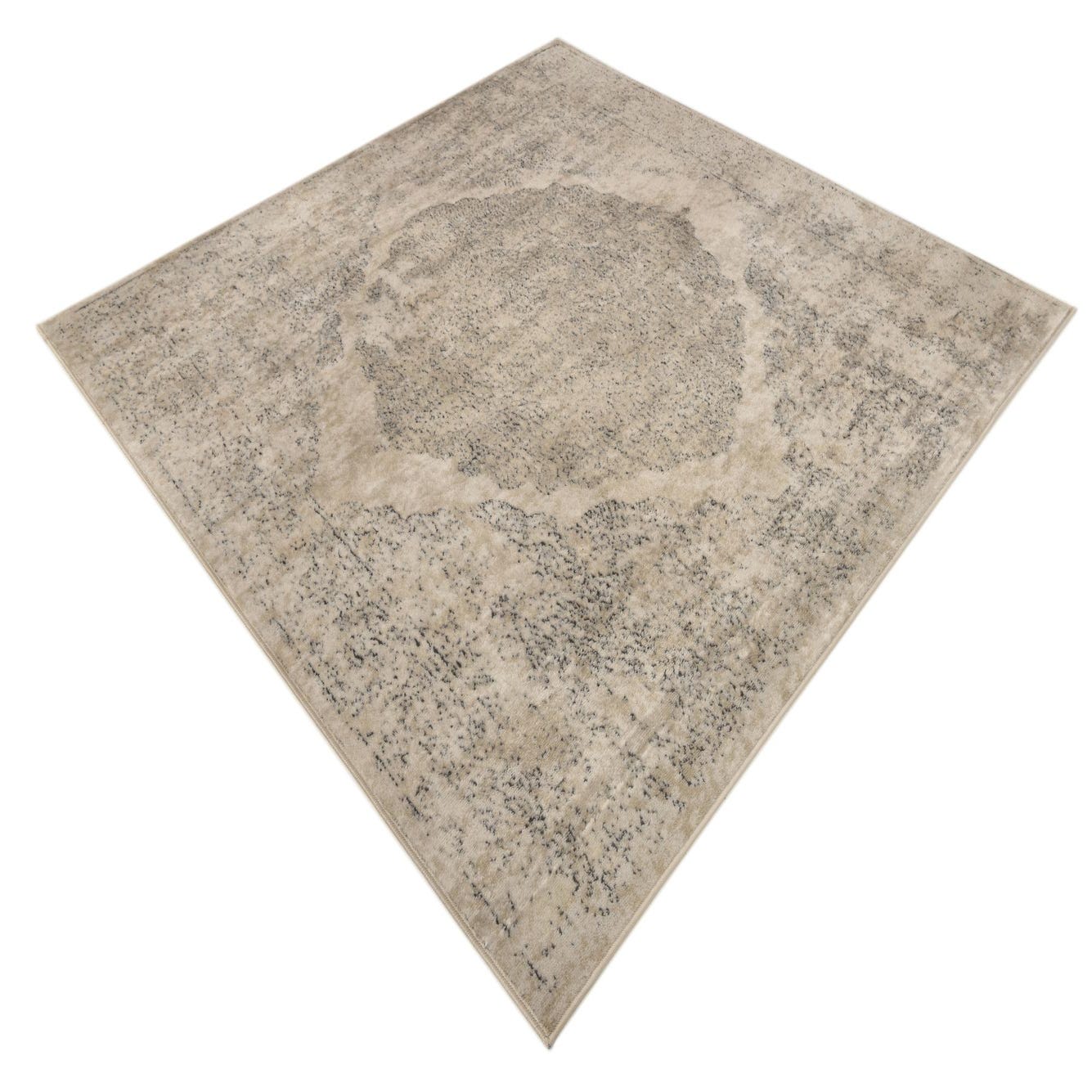 A soft, vintage-inspired medallion takes center stage on an ivory ground, with warm beige tones and fine gray speckling that create a gently worn, lived-in look. The pattern is purposely muted — a faded central motif and subtle distressed markings blend into the field for a low-contrast, layered effect. Machine made from 85% polypropylene and 15% polyester, the low-to-medium pile has a smooth, slightly plush hand and modest sculpting that highlights the medallion without overwhelming the surface.