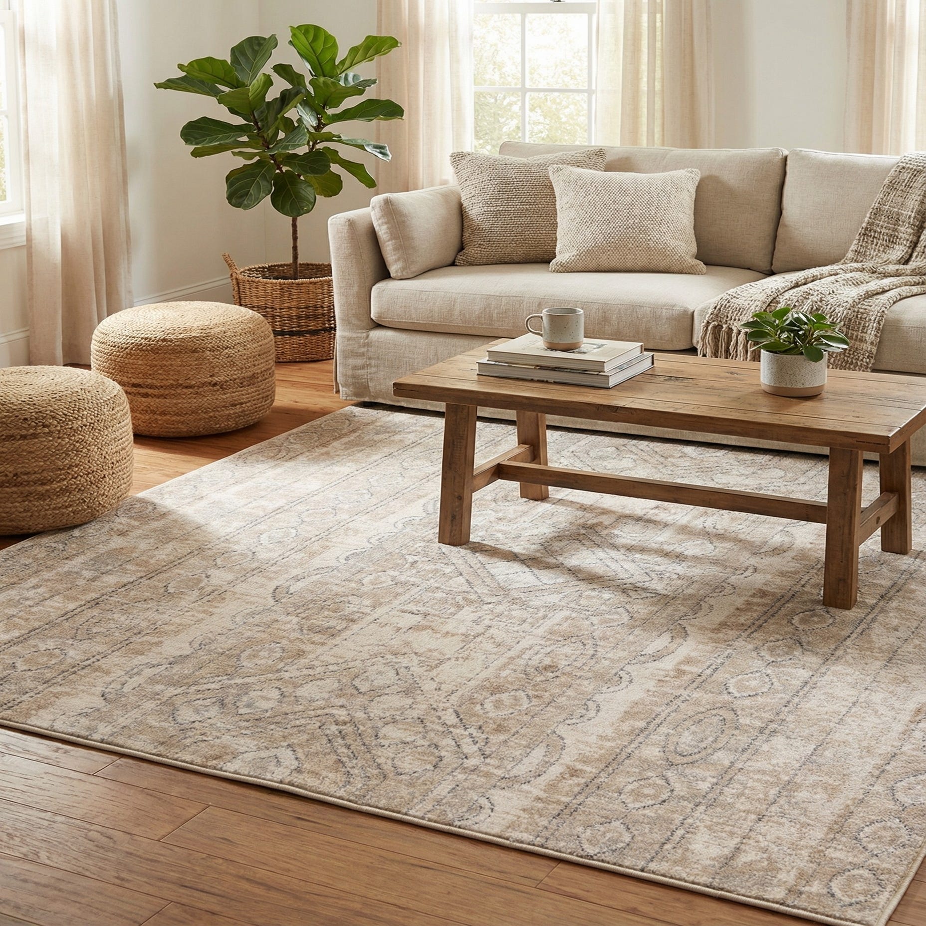 Machine-made from an 85% polypropylene and 15% polyester blend, the pile has a low-profile, slightly plush hand and a soft sheen that highlights the pattern’s tonal shifts. It feels pleasant underfoot and lays flat for straightforward placement in seating areas or beneath bedroom furniture. This rug pairs well with natural wood and linen furnishings, and complements transitional, modern farmhouse, Scandinavian, or coastal interiors—use it to anchor a living room seating group, layer under a bed to add warmth, or soften a contemporary dining space.