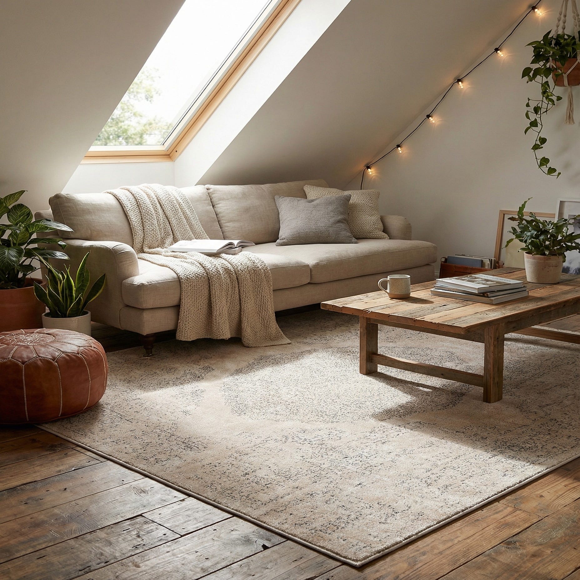 The square format makes this piece ideal for anchoring a small seating area, softening hardwood floors in a bedroom, or centering beneath a compact dining or workspace. Its neutral palette pairs nicely with natural woods, linen upholstery, leather accents, and warm metals, fitting transitional, modern farmhouse, Scandinavian, or contemporary interiors that favor calm, textured layers.