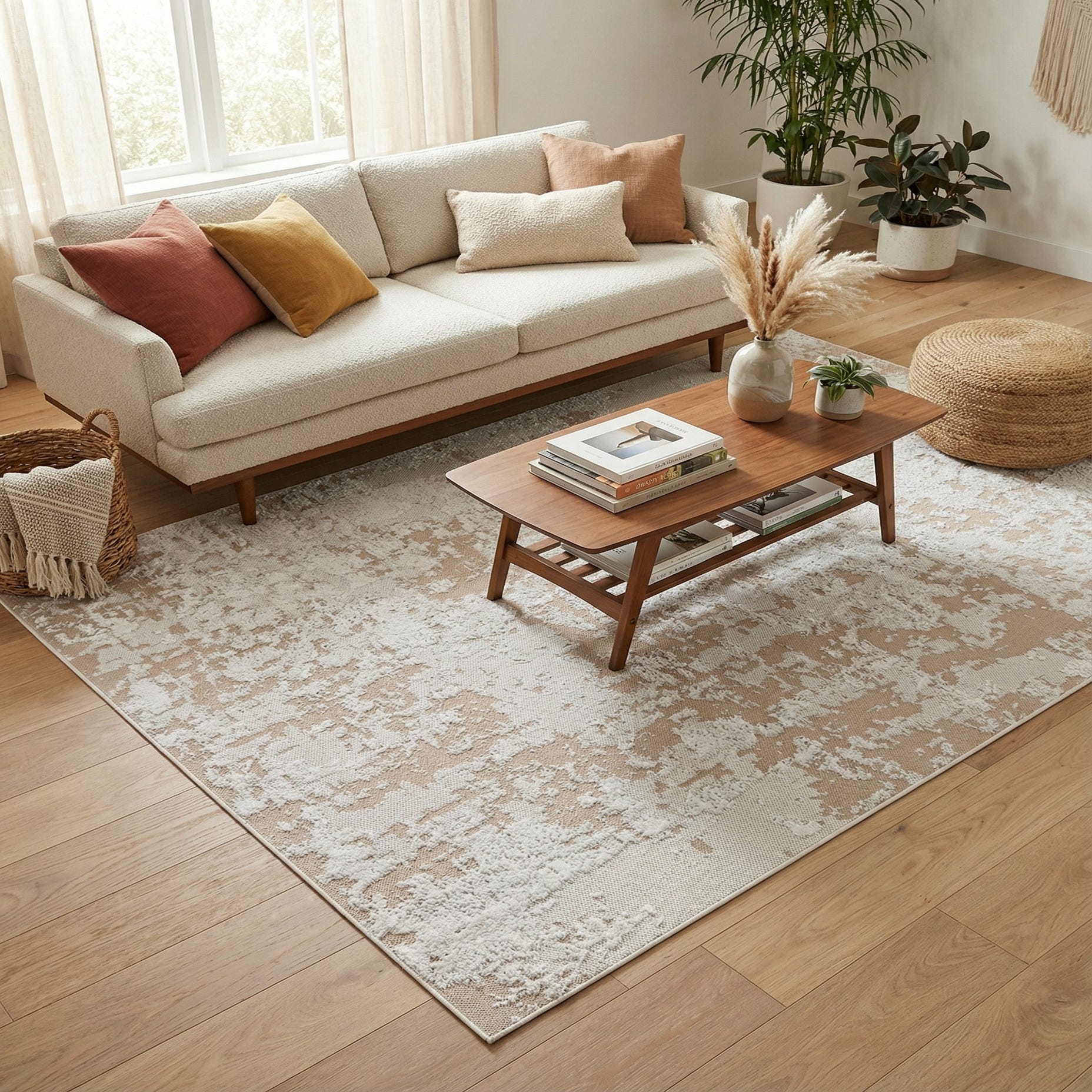 Place this rug in a light, airy living room beneath a low-profile sofa to anchor the seating area, or at the foot of a bed to add a quiet layer of warmth. It pairs naturally with pale woods, linen upholstery and minimalist decor, and also complements a coastal or modern farmhouse palette. Because of its neutral tones and understated pattern, it works well as a unifying piece in open-plan spaces or as a subtle backdrop for bolder furniture and accessory choices.