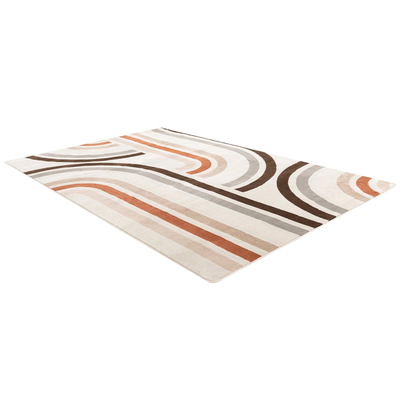 A 6x9 rectangular ivory rug with a modern abstract pattern of curved and straight lines in brown, grey, and terracotta.